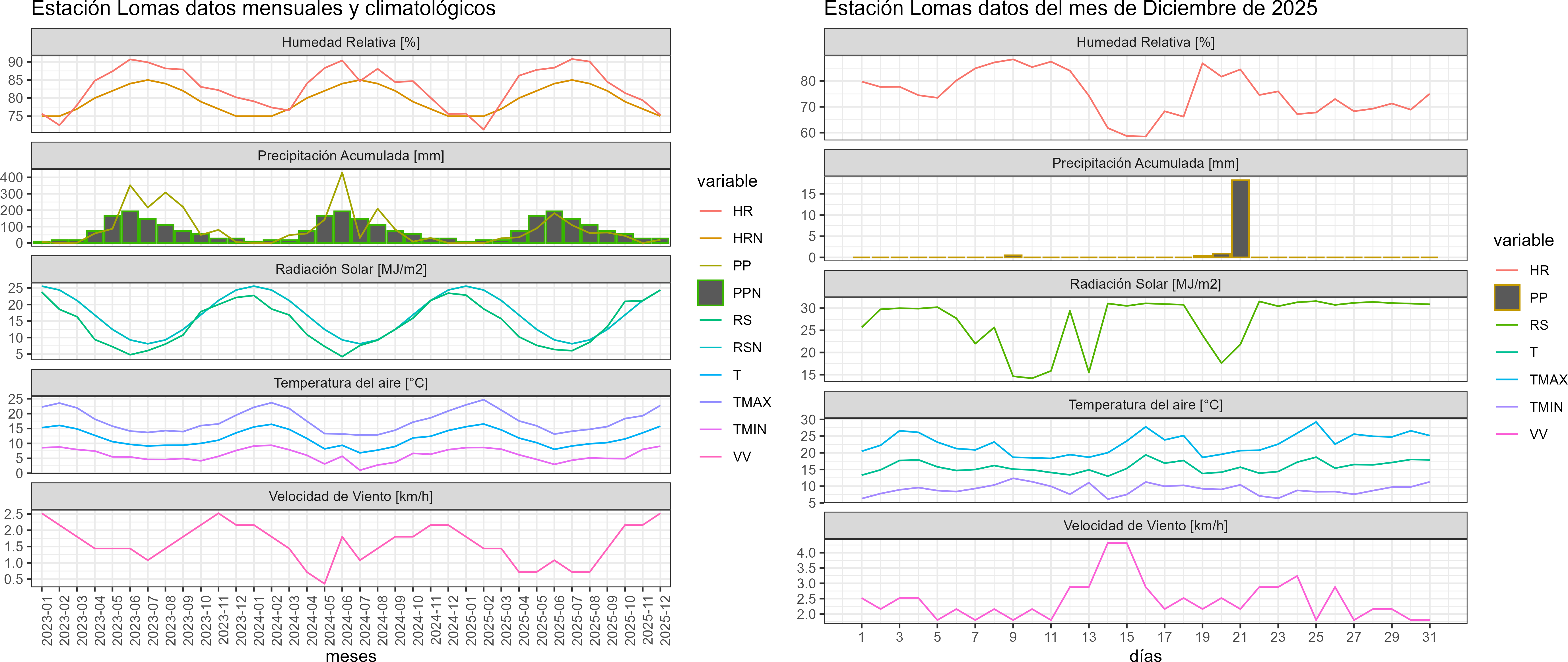 La estación Lomas corresponde al distrito agroclimático 7-8-1. Para este distrito climático la temperatura mínima, media y máxima climatológicas alcanzan los 9.9°C, 15°C y 20.1°C respectivamente. Por su parte, respecto a las temperaturas medidas durante el mes de diciembre en la estación: la temperatura mínima alcanzo los 9.1°C (-0.8°C bajo la climatológica), la temperatura media 15.8°C (0.8°C sobre la climatológica) y la temperatura máxima llegó a los 22.7°C (2.6°C sobre la climatológica). En el mes de diciembre se registró una pluviometría de 19.9 mm, lo cual representa un 124.4% con respecto al mismo mes de un año normal. De enero a diciembre se ha registrado un total acumulado de 635.6 mm, en circunstancias que un año normal registraría a la fecha 975 mm, lo que representa un déficit de 34.8%. A la misma fecha, durante el año 2024 la precipitación alcanzaba los 0.8 mm.