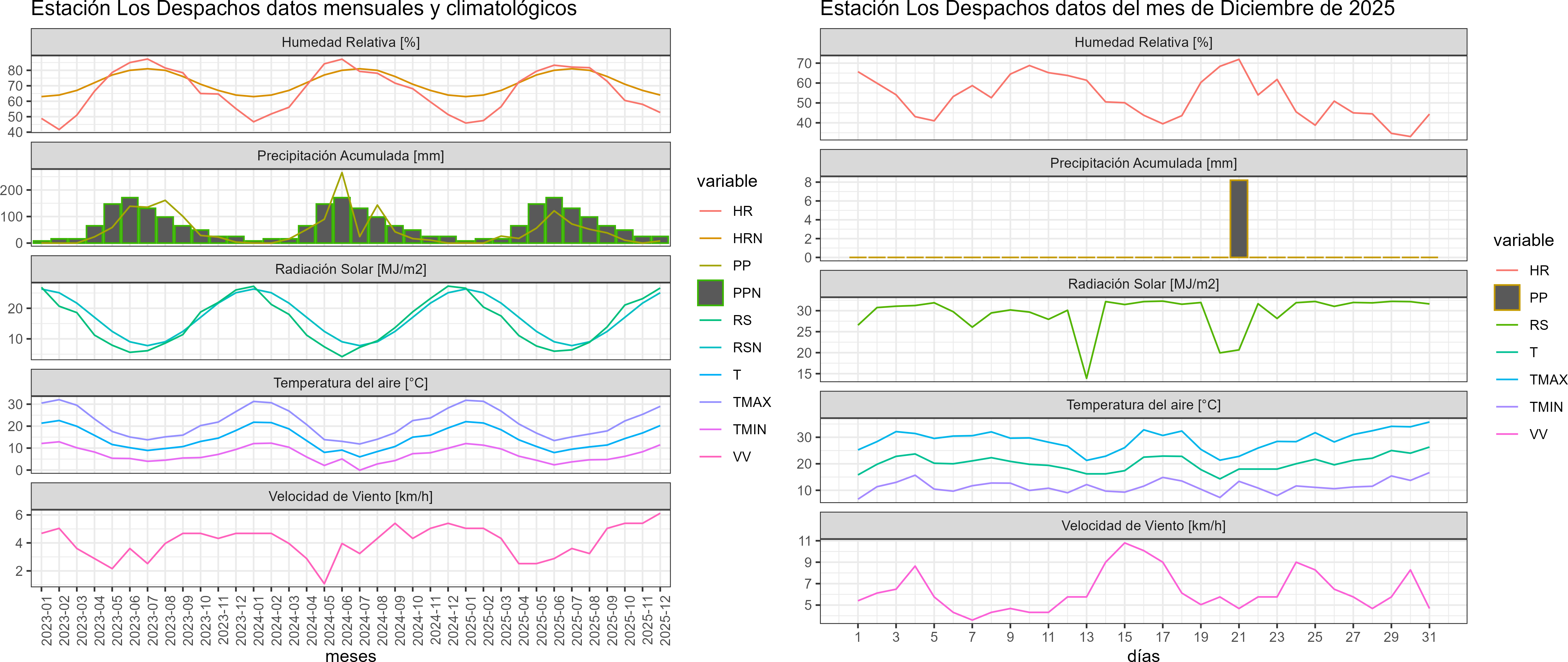 La estación Los Despachos corresponde al distrito agroclimático 7-8-3. Para este distrito climático la temperatura mínima, media y máxima climatológicas alcanzan los 10.1°C, 18.3°C y 26.5°C respectivamente. Por su parte, respecto a las temperaturas medidas durante el mes de diciembre en la estación: la temperatura mínima alcanzo los 11.5°C (1.4°C sobre la climatológica), la temperatura media 20.3°C (2°C sobre la climatológica) y la temperatura máxima llegó a los 29°C (2.5°C sobre la climatológica). En el mes de diciembre se registró una pluviometría de 8.2 mm, lo cual representa un 74.5% con respecto al mismo mes de un año normal. De enero a diciembre se ha registrado un total acumulado de 403.5 mm, en circunstancias que un año normal registraría a la fecha 786 mm, lo que representa un déficit de 48.7%. A la misma fecha, durante el año 2024 la precipitación alcanzaba los 0 mm.