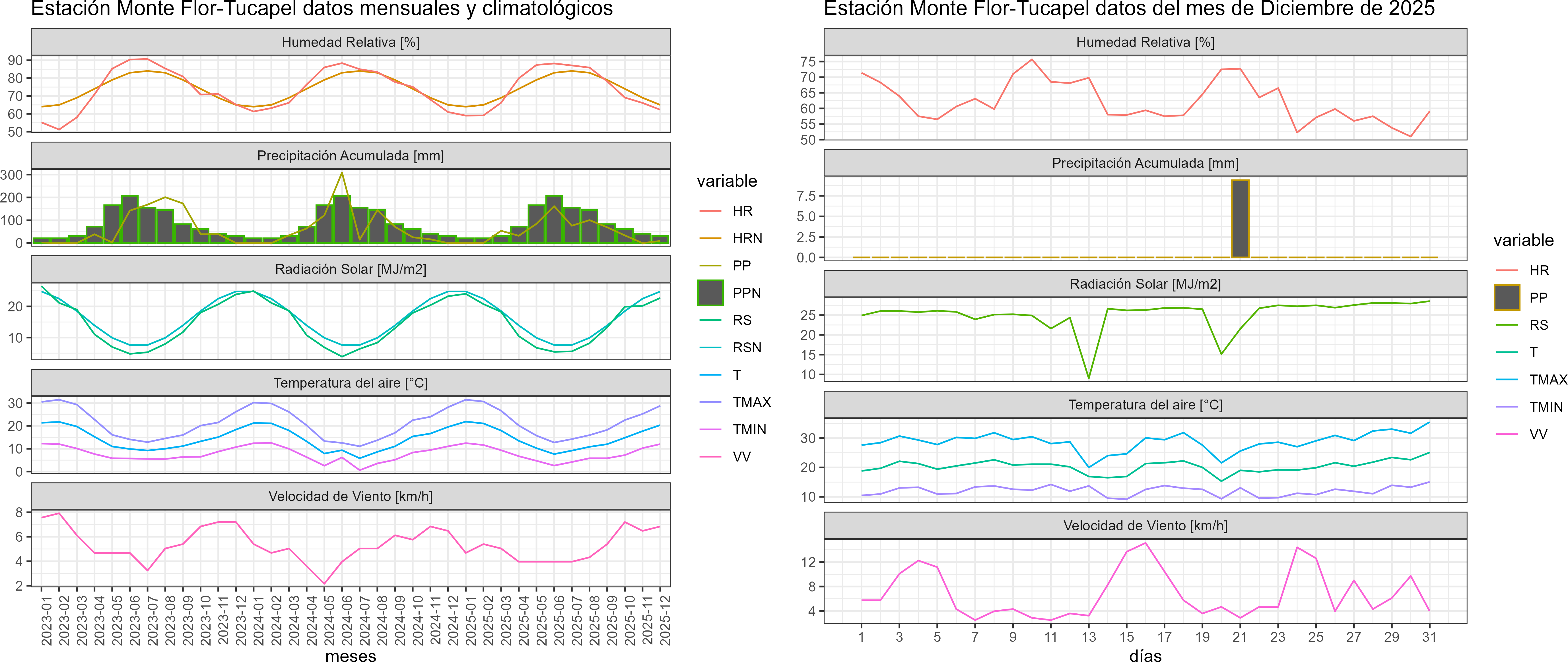 La estación Monte Flor-Tucapel corresponde al distrito agroclimático 7-9-1. Para este distrito climático la temperatura mínima, media y máxima climatológicas alcanzan los 10°C, 19.2°C y 28.4°C respectivamente. Por su parte, respecto a las temperaturas medidas durante el mes de diciembre en la estación: la temperatura mínima alcanzo los 12°C (2°C sobre la climatológica), la temperatura media 20.3°C (1.1°C sobre la climatológica) y la temperatura máxima llegó a los 28.8°C (0.4°C sobre la climatológica). En el mes de diciembre se registró una pluviometría de 9.4 mm, lo cual representa un 62.7% con respecto al mismo mes de un año normal. De enero a diciembre se ha registrado un total acumulado de 621.1 mm, en circunstancias que un año normal registraría a la fecha 895 mm, lo que representa un déficit de 30.6%. A la misma fecha, durante el año 2024 la precipitación alcanzaba los 0 mm.