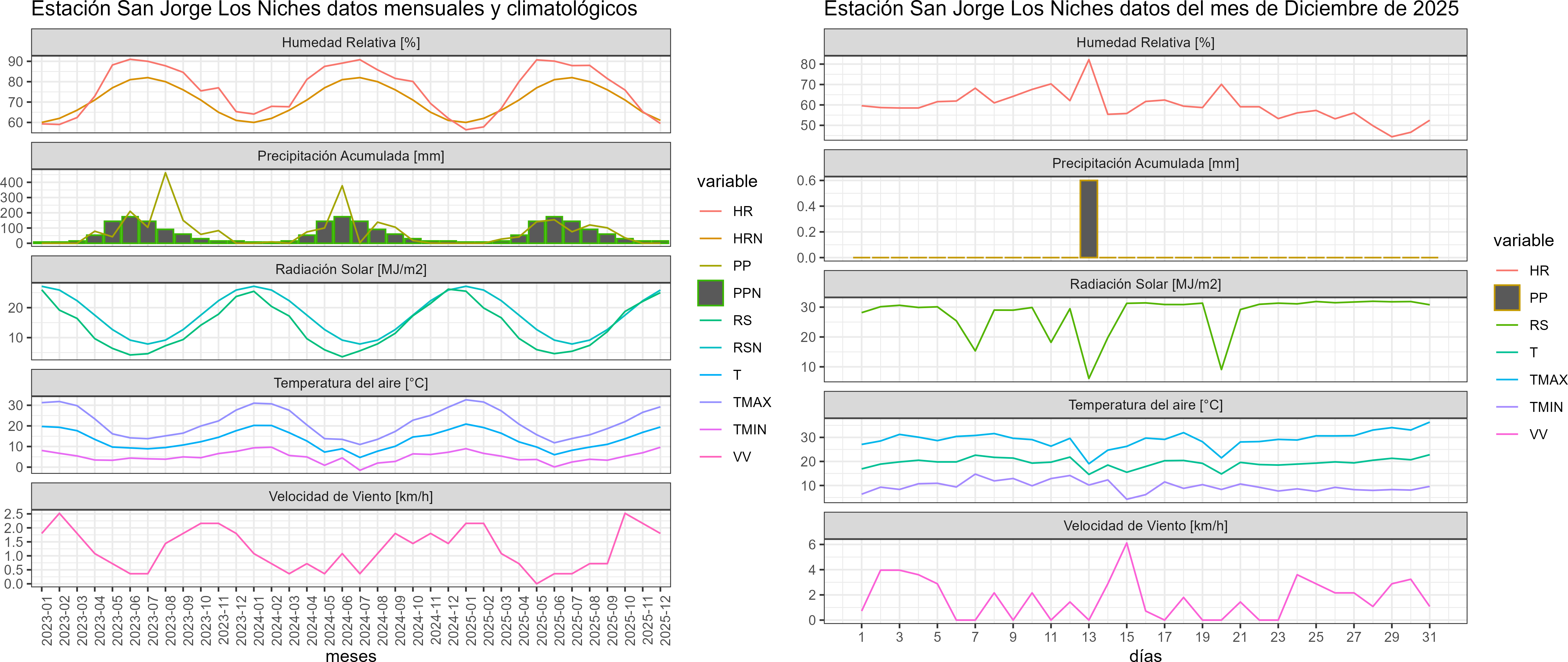 La estación San Jorge Los Niches corresponde al distrito agroclimático 6-7-4. Para este distrito climático la temperatura mínima, media y máxima climatológicas alcanzan los 9.9°C, 19°C y 28°C respectivamente. Por su parte, respecto a las temperaturas medidas durante el mes de diciembre en la estación: la temperatura mínima alcanzo los 9.6°C (-0.3°C bajo la climatológica), la temperatura media 19.4°C (0.4°C sobre la climatológica) y la temperatura máxima llegó a los 29.2°C (1.2°C sobre la climatológica). En el mes de diciembre se registró una pluviometría de 0.6 mm, lo cual representa un 4% con respecto al mismo mes de un año normal. De enero a diciembre se ha registrado un total acumulado de 697.8 mm, en circunstancias que un año normal registraría a la fecha 826 mm, lo que representa un déficit de 15.5%. A la misma fecha, durante el año 2024 la precipitación alcanzaba los 0 mm.