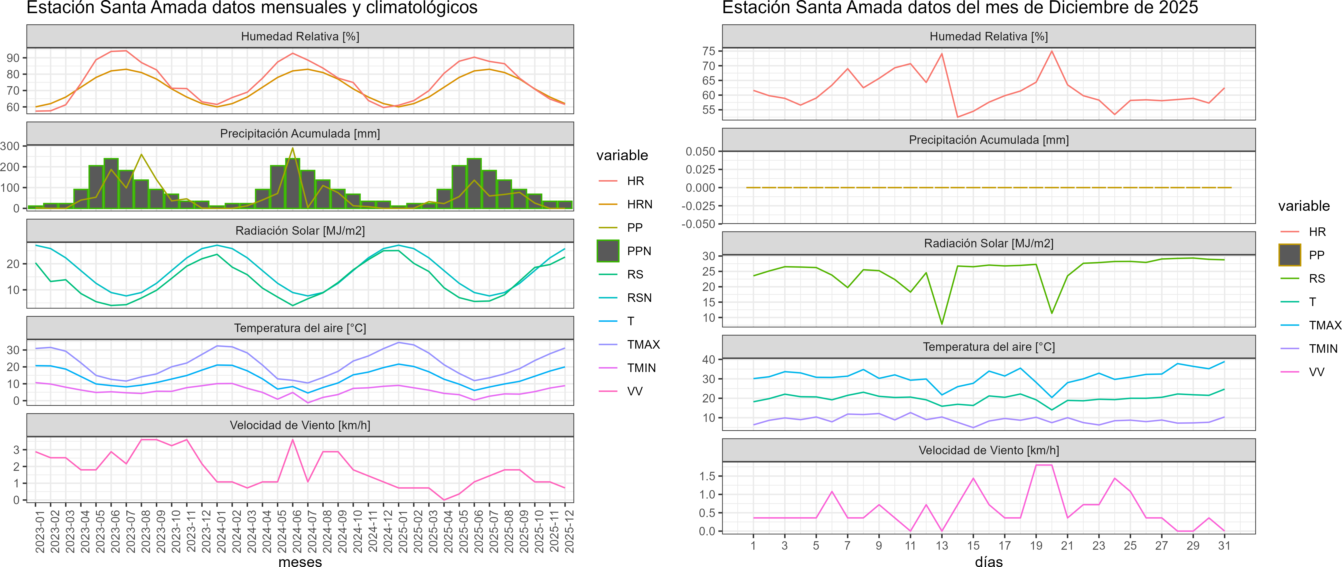 La estación Santa Amada corresponde al distrito agroclimático 7-8-5. Para este distrito climático la temperatura mínima, media y máxima climatológicas alcanzan los 9.7°C, 19.1°C y 28.6°C respectivamente. Por su parte, respecto a las temperaturas medidas durante el mes de diciembre en la estación: la temperatura mínima alcanzo los 8.9°C (-0.8°C bajo la climatológica), la temperatura media 20°C (0.9°C sobre la climatológica) y la temperatura máxima llegó a los 31.2°C (2.6°C sobre la climatológica). En el mes de diciembre se registró una pluviometría de 0 mm, lo cual representa un 0% con respecto al mismo mes de un año normal. De enero a diciembre se ha registrado un total acumulado de 477.3 mm, en circunstancias que un año normal registraría a la fecha 878 mm, lo que representa un déficit de 45.6%. A la misma fecha, durante el año 2024 la precipitación alcanzaba los 0 mm.