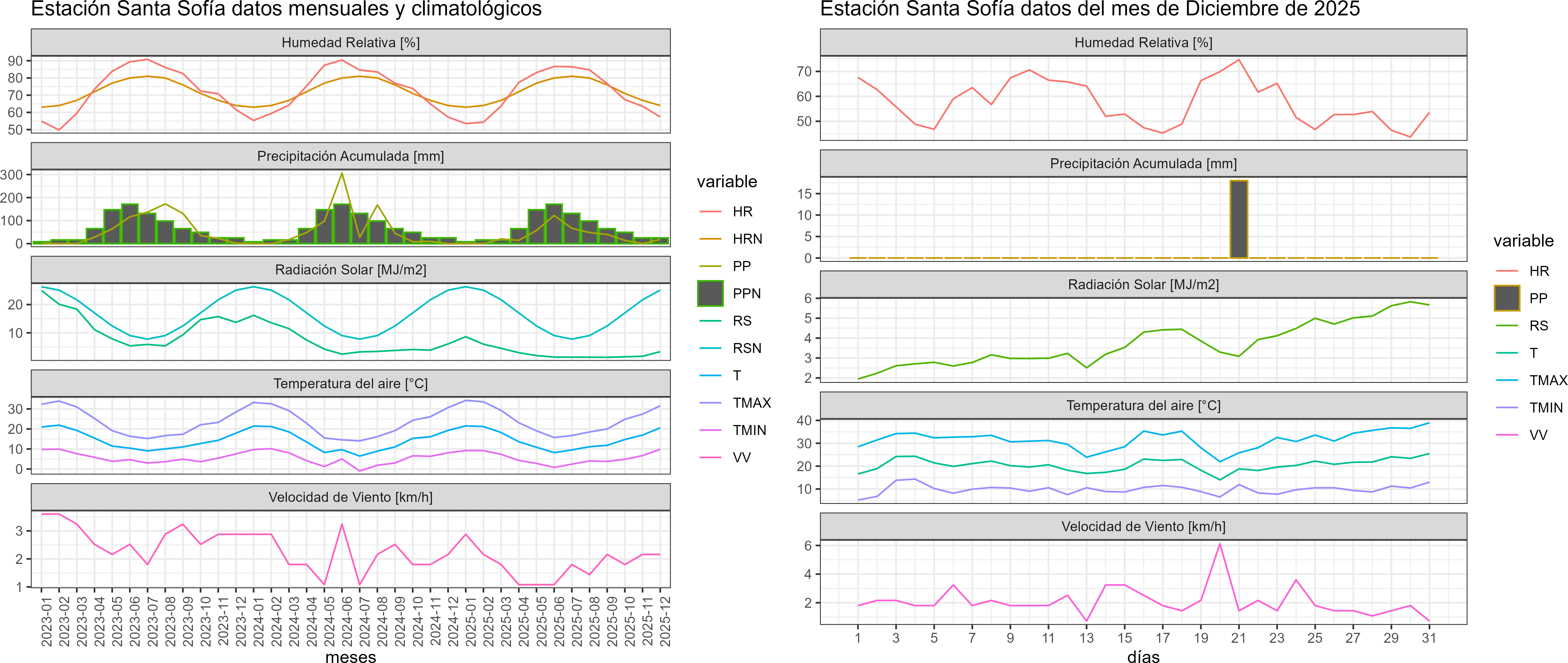 La estación Santa Sofía corresponde al distrito agroclimático 7-8-3. Para este distrito climático la temperatura mínima, media y máxima climatológicas alcanzan los 9.8°C, 17.9°C y 26°C respectivamente. Por su parte, respecto a las temperaturas medidas durante el mes de diciembre en la estación: la temperatura mínima alcanzo los 9.8°C (Igual al valor climatológico), la temperatura media 20.5°C (2.6°C sobre la climatológica) y la temperatura máxima llegó a los 31.6°C (5.6°C sobre la climatológica). En el mes de diciembre se registró una pluviometría de 18 mm, lo cual representa un 200% con respecto al mismo mes de un año normal. De enero a diciembre se ha registrado un total acumulado de 401.2 mm, en circunstancias que un año normal registraría a la fecha 791 mm, lo que representa un déficit de 49.3%. A la misma fecha, durante el año 2024 la precipitación alcanzaba los 0 mm.