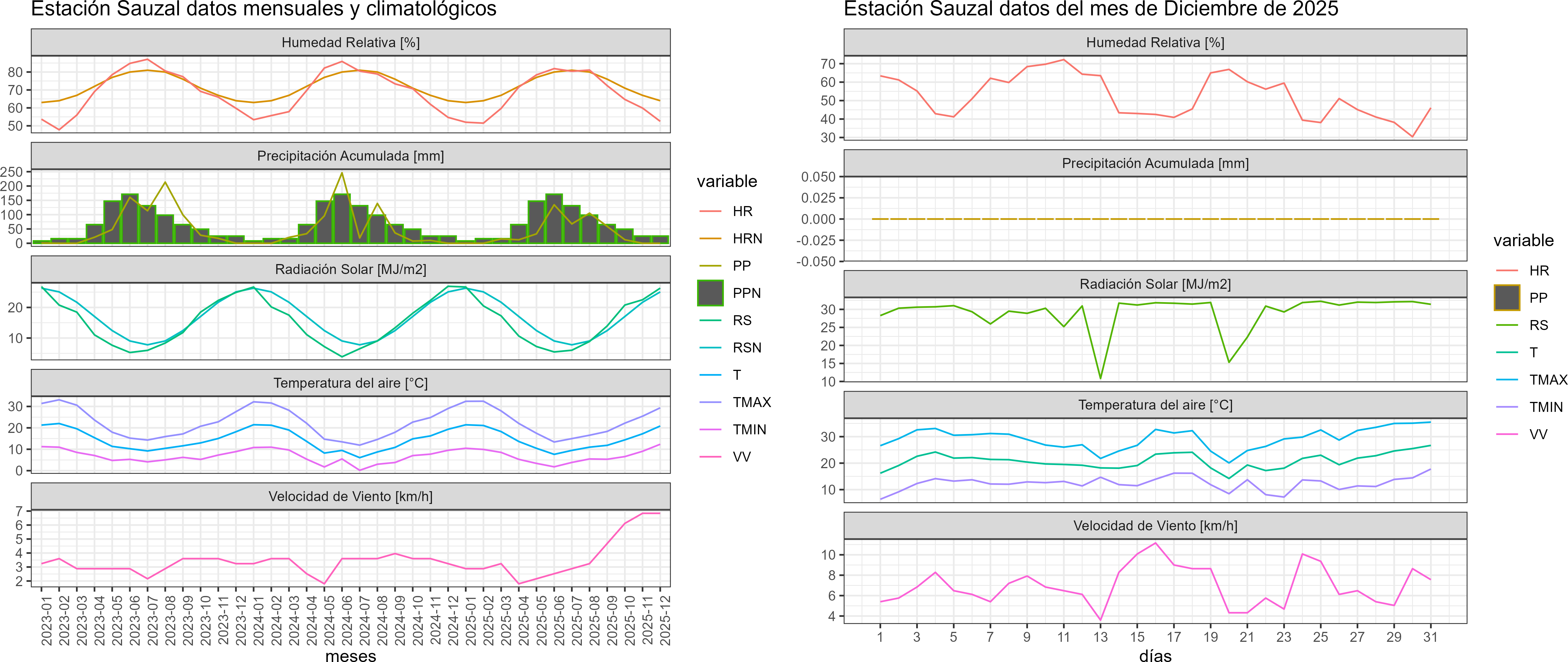 La estación Sauzal corresponde al distrito agroclimático 7-8-3. Para este distrito climático la temperatura mínima, media y máxima climatológicas alcanzan los 9.8°C, 19.1°C y 28.4°C respectivamente. Por su parte, respecto a las temperaturas medidas durante el mes de diciembre en la estación: la temperatura mínima alcanzo los 12.3°C (2.5°C sobre la climatológica), la temperatura media 20.9°C (1.8°C sobre la climatológica) y la temperatura máxima llegó a los 29.4°C (1°C sobre la climatológica). En el mes de diciembre se registró una pluviometría de 0 mm, lo cual representa un 0% con respecto al mismo mes de un año normal. De enero a diciembre se ha registrado un total acumulado de 438.7 mm, en circunstancias que un año normal registraría a la fecha 673 mm, lo que representa un déficit de 34.8%. A la misma fecha, durante el año 2024 la precipitación alcanzaba los 0 mm.