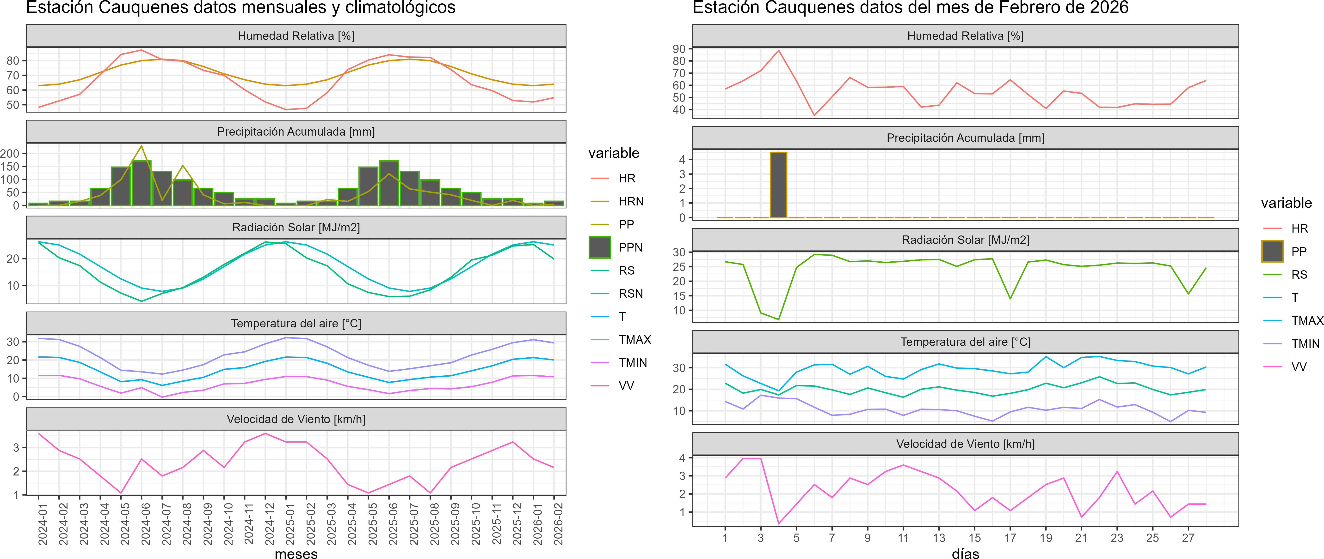 La estación Cauquenes corresponde al distrito agroclimático 7-8-3. Para este distrito climático la temperatura mínima, media y máxima climatológicas alcanzan los 10.7°C, 20.3°C y 29.9°C respectivamente. Por su parte, respecto a las temperaturas medidas durante el mes de febrero en la estación: la temperatura mínima alcanzo los 10.8°C (0.1°C sobre la climatológica), la temperatura media 20.1°C (-0.2°C bajo la climatológica) y la temperatura máxima llegó a los 29.4°C (-0.5°C bajo la climatológica). En el mes de febrero se registró una pluviometría de 4.5 mm, lo cual representa un 45% con respecto al mismo mes de un año normal. De enero a febrero se ha registrado un total acumulado de 4.5 mm, en circunstancias que un año normal registraría a la fecha 14 mm, lo que representa un déficit de 67.9%. A la misma fecha, durante el año 2024 la precipitación alcanzaba los 0 mm.