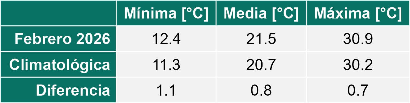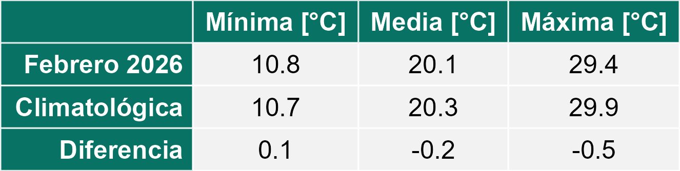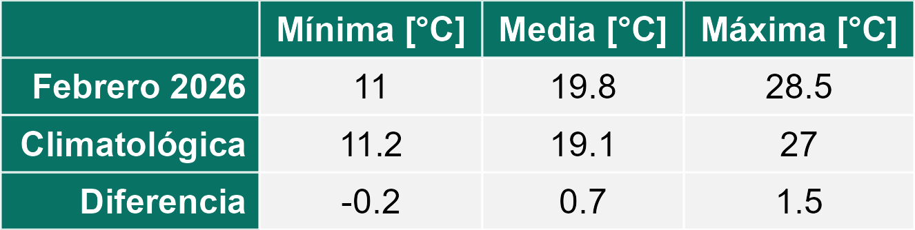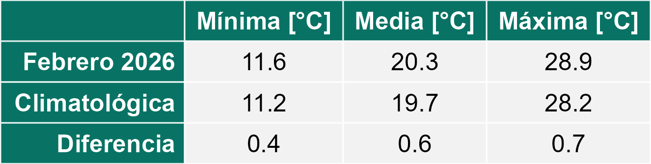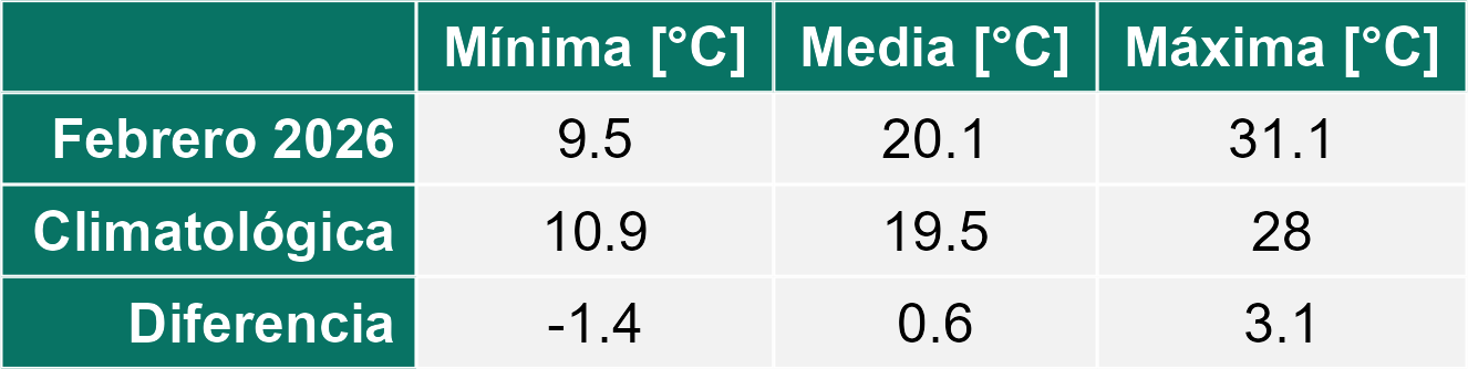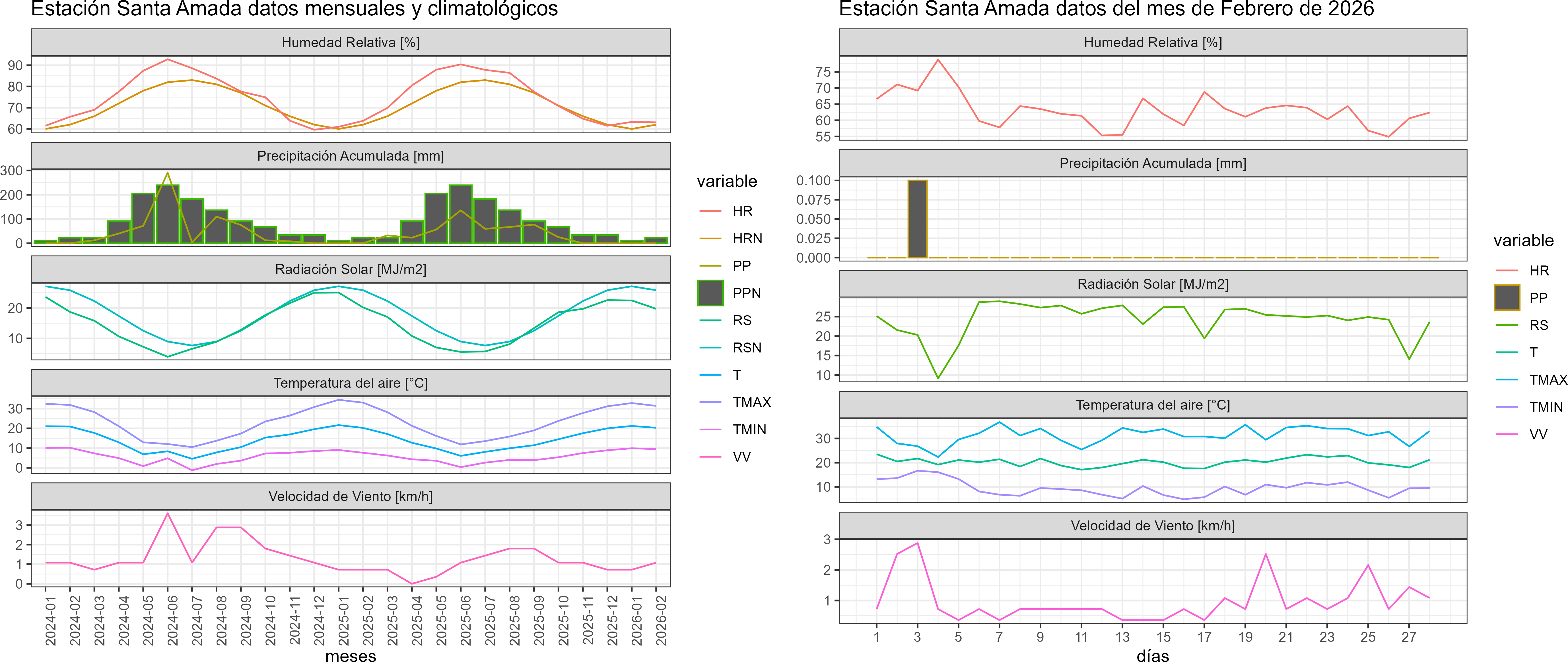 La estación Santa Amada corresponde al distrito agroclimático 7-8-5. Para este distrito climático la temperatura mínima, media y máxima climatológicas alcanzan los 10.3°C, 20°C y 29.6°C respectivamente. Por su parte, respecto a las temperaturas medidas durante el mes de febrero en la estación: la temperatura mínima alcanzo los 9.5°C (-0.8°C bajo la climatológica), la temperatura media 20.3°C (0.3°C sobre la climatológica) y la temperatura máxima llegó a los 31.4°C (1.8°C sobre la climatológica). En el mes de febrero se registró una pluviometría de 0.1 mm, lo cual representa un 1.1% con respecto al mismo mes de un año normal. De enero a febrero se ha registrado un total acumulado de 0.1 mm, en circunstancias que un año normal registraría a la fecha 15 mm, lo que representa un déficit de 99.3%. A la misma fecha, durante el año 2024 la precipitación alcanzaba los 0.5 mm.
