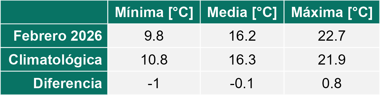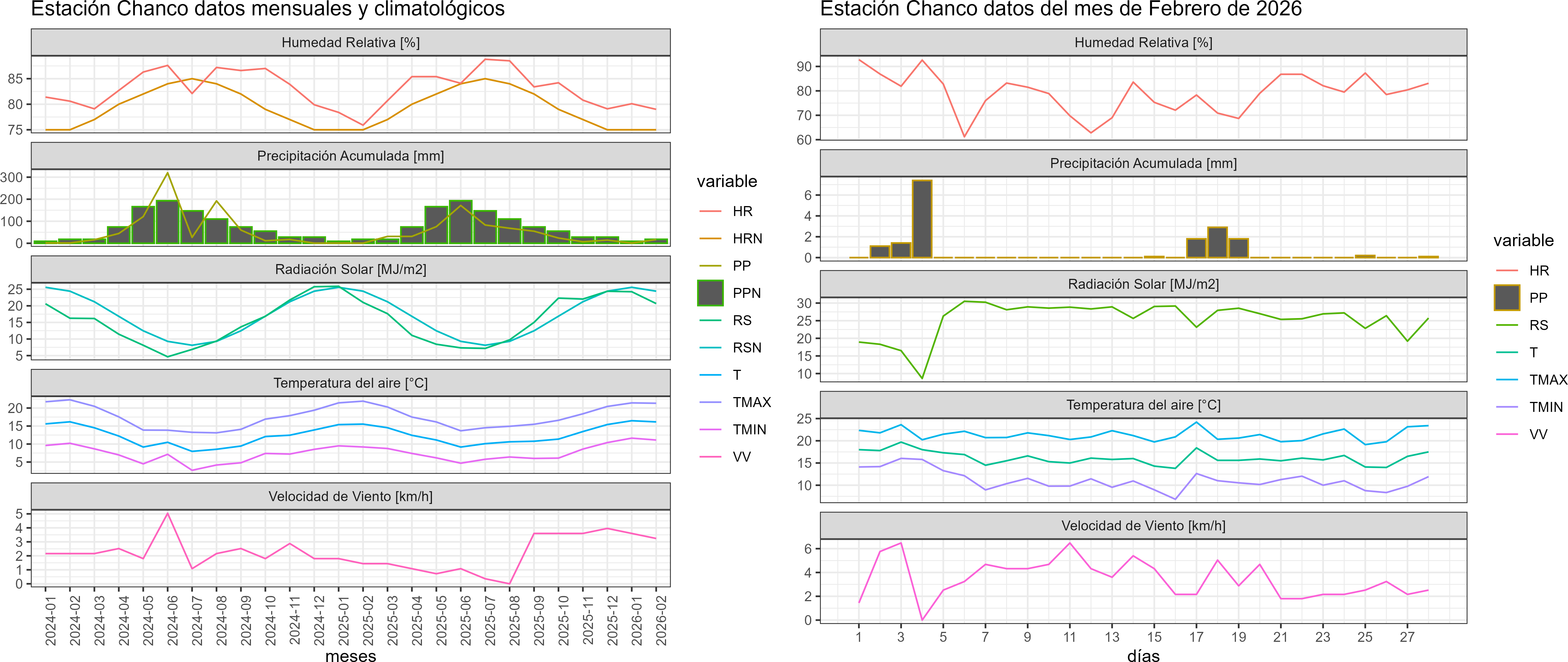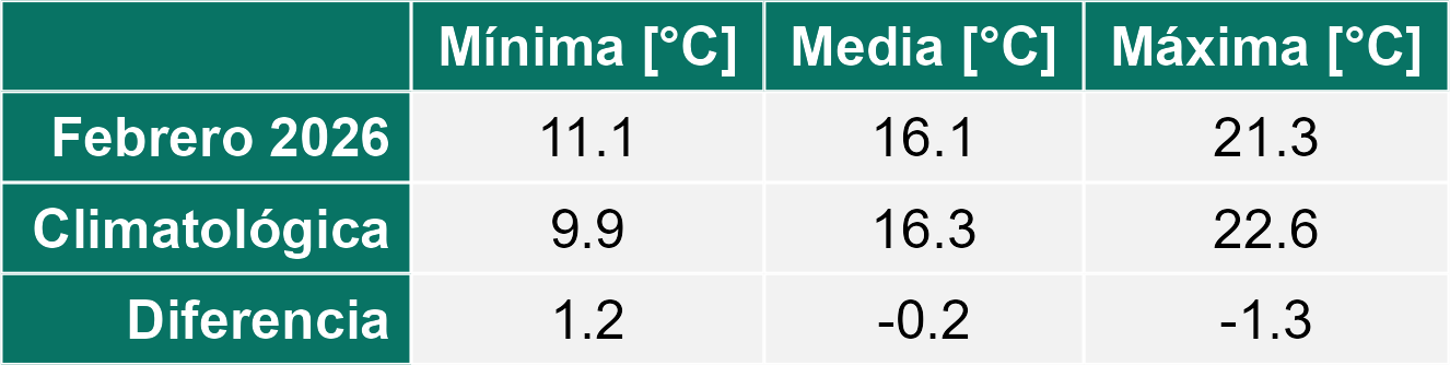 La estación Chanco corresponde al distrito agroclimático 7-8-1. Para este distrito climático la temperatura mínima, media y máxima climatológicas alcanzan los 9.9°C, 16.3°C y 22.6°C respectivamente. Por su parte, respecto a las temperaturas medidas durante el mes de febrero en la estación: la temperatura mínima alcanzo los 11.1°C (1.2°C sobre la climatológica), la temperatura media 16.1°C (-0.2°C bajo la climatológica) y la temperatura máxima llegó a los 21.3°C (-1.3°C bajo la climatológica). En el mes de febrero se registró una pluviometría de 16.8 mm, lo cual representa un 152.7% con respecto al mismo mes de un año normal. De enero a febrero se ha registrado un total acumulado de 17.7 mm, en circunstancias que un año normal registraría a la fecha 15 mm, lo que representa un superávit de 18%. A la misma fecha, durante el año 2024 la precipitación alcanzaba los 0.7 mm.
