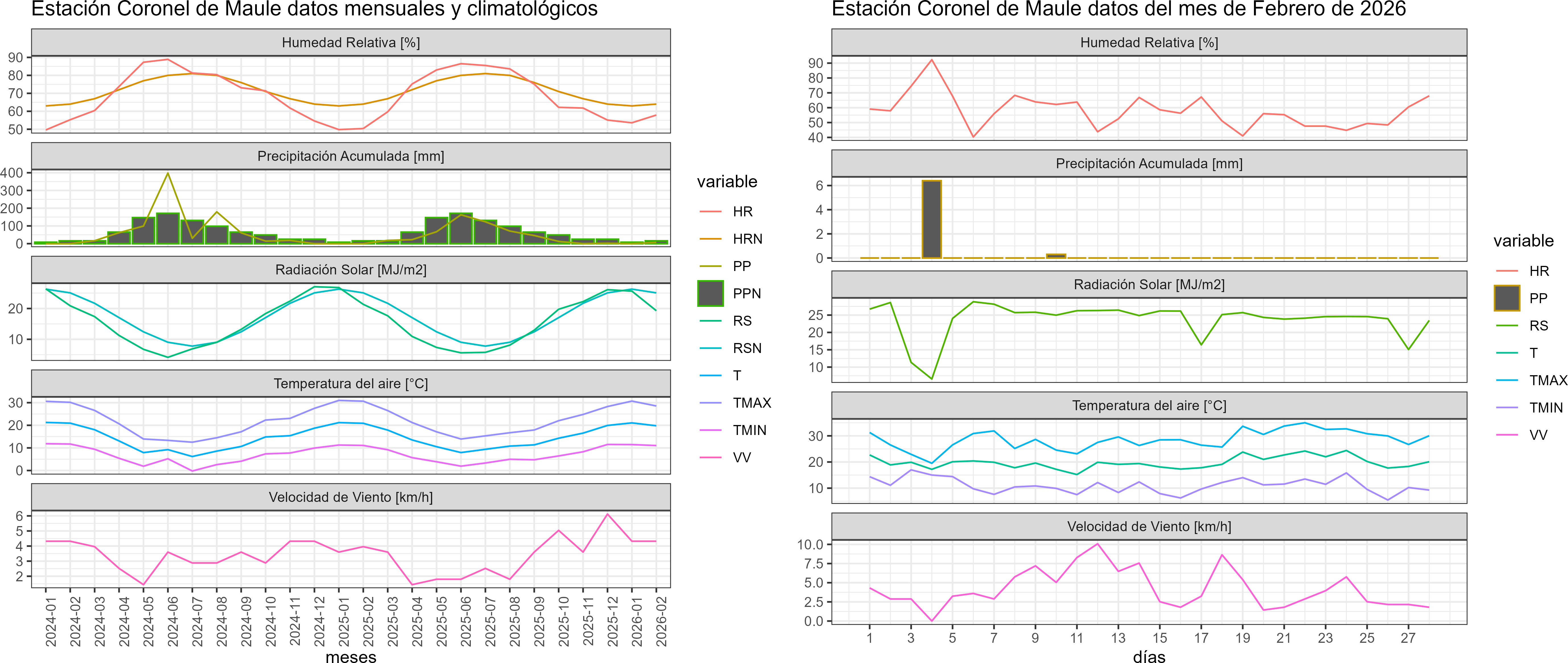 La estación Coronel de Maule corresponde al distrito agroclimático 7-8-3. Para este distrito climático la temperatura mínima, media y máxima climatológicas alcanzan los 11.2°C, 19.1°C y 27°C respectivamente. Por su parte, respecto a las temperaturas medidas durante el mes de febrero en la estación: la temperatura mínima alcanzo los 11°C (-0.2°C bajo la climatológica), la temperatura media 19.8°C (0.7°C sobre la climatológica) y la temperatura máxima llegó a los 28.5°C (1.5°C sobre la climatológica). En el mes de febrero se registró una pluviometría de 6.7 mm, lo cual representa un 60.9% con respecto al mismo mes de un año normal. De enero a febrero se ha registrado un total acumulado de 6.7 mm, en circunstancias que un año normal registraría a la fecha 15 mm, lo que representa un déficit de 55.3%. A la misma fecha, durante el año 2024 la precipitación alcanzaba los 0 mm.