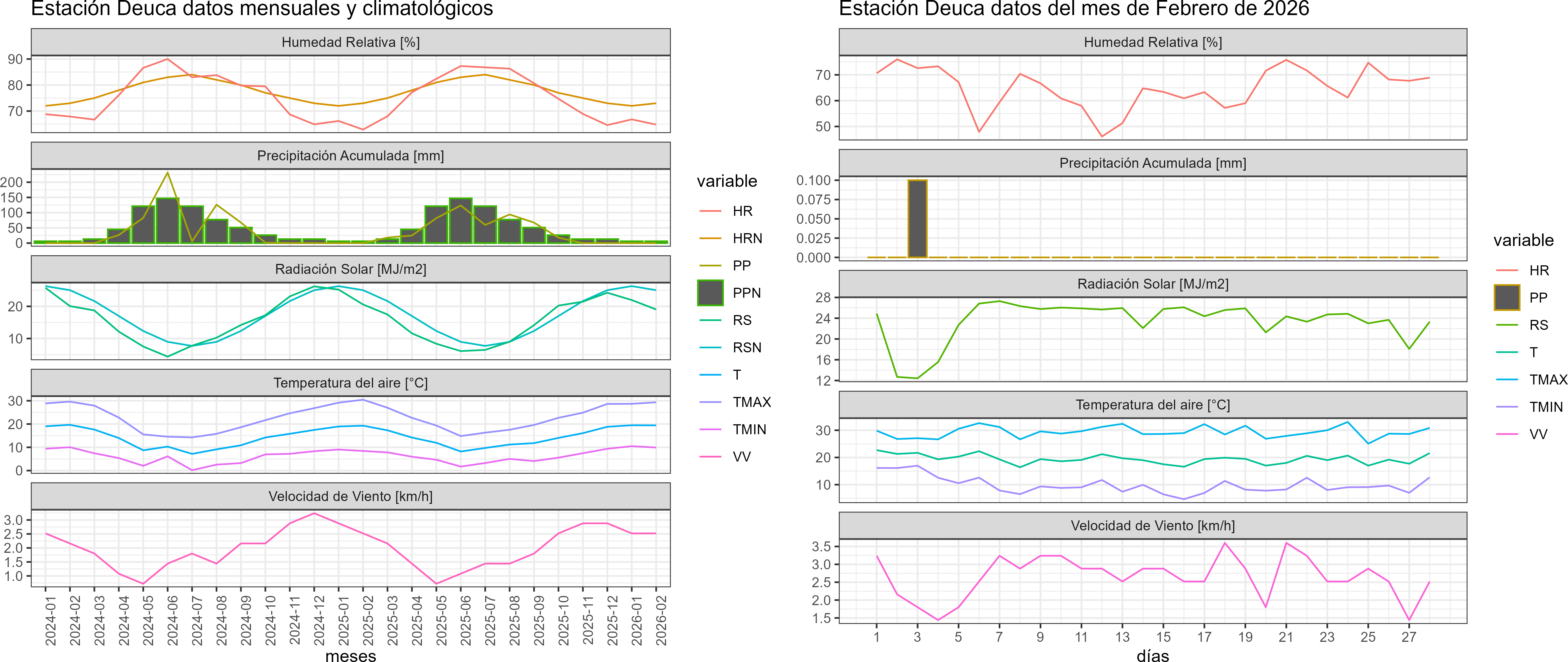 La estación Deuca corresponde al distrito agroclimático 6-7-1. Para este distrito climático la temperatura mínima, media y máxima climatológicas alcanzan los 10.1°C, 19.4°C y 28.7°C respectivamente. Por su parte, respecto a las temperaturas medidas durante el mes de febrero en la estación: la temperatura mínima alcanzo los 9.9°C (-0.2°C bajo la climatológica), la temperatura media 19.4°C (Igual al valor climatológico) y la temperatura máxima llegó a los 29.3°C (0.6°C sobre la climatológica). En el mes de febrero se registró una pluviometría de 0.1 mm, lo cual representa un 2.5% con respecto al mismo mes de un año normal. De enero a febrero se ha registrado un total acumulado de 0.2 mm, en circunstancias que un año normal registraría a la fecha 6 mm, lo que representa un déficit de 96.7%. A la misma fecha, durante el año 2024 la precipitación alcanzaba los 0 mm.