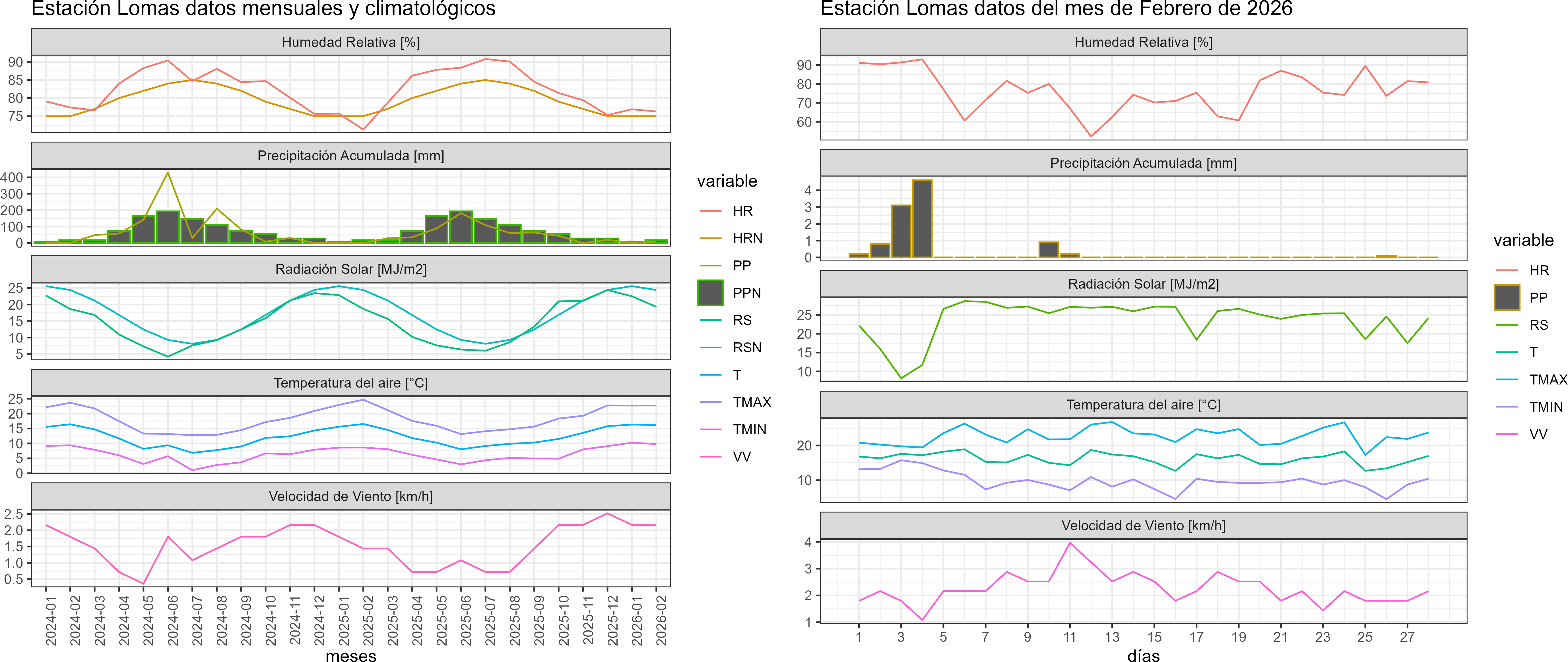 La estación Lomas corresponde al distrito agroclimático 7-8-1. Para este distrito climático la temperatura mínima, media y máxima climatológicas alcanzan los 10.8°C, 16.3°C y 21.9°C respectivamente. Por su parte, respecto a las temperaturas medidas durante el mes de febrero en la estación: la temperatura mínima alcanzo los 9.8°C (-1°C bajo la climatológica), la temperatura media 16.2°C (-0.1°C bajo la climatológica) y la temperatura máxima llegó a los 22.7°C (0.8°C sobre la climatológica). En el mes de febrero se registró una pluviometría de 9.9 mm, lo cual representa un 66% con respecto al mismo mes de un año normal. De enero a febrero se ha registrado un total acumulado de 10.3 mm, en circunstancias que un año normal registraría a la fecha 21 mm, lo que representa un déficit de 51%. A la misma fecha, durante el año 2024 la precipitación alcanzaba los 0 mm.