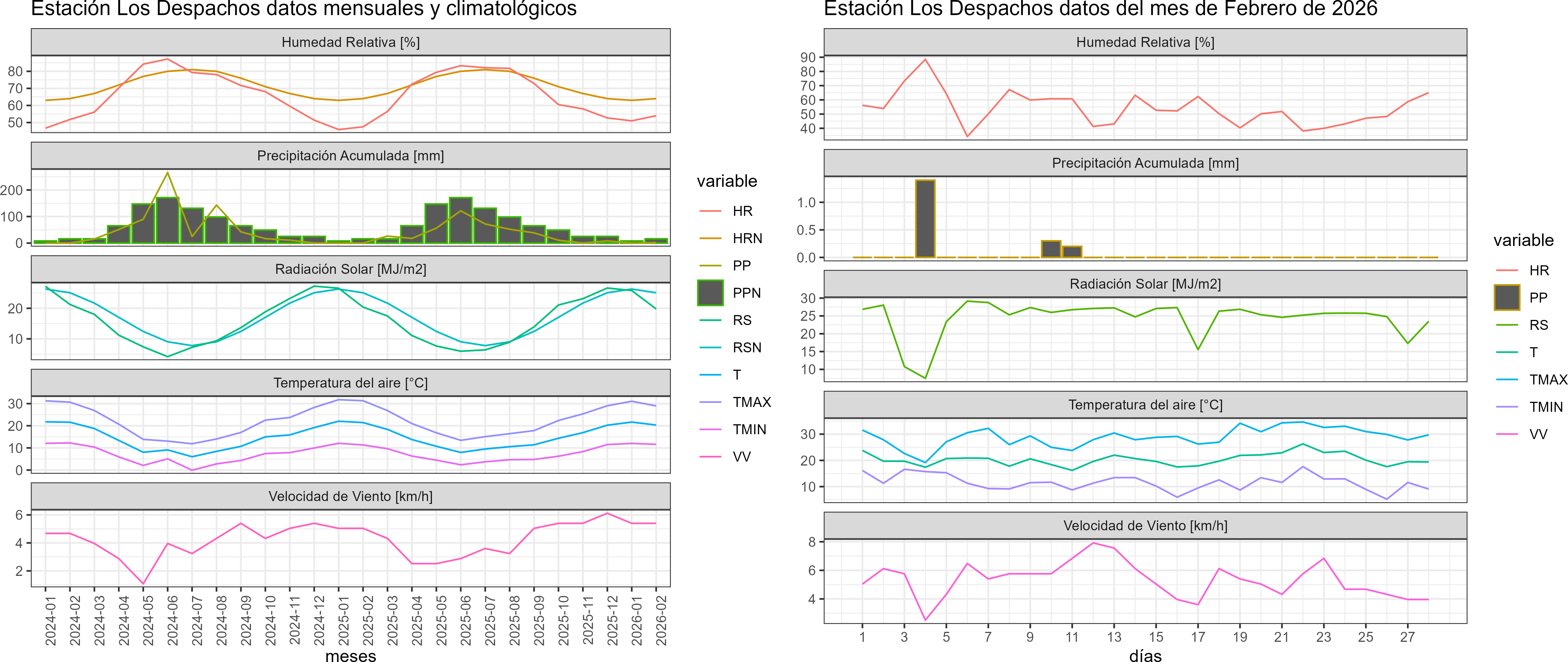 La estación Los Despachos corresponde al distrito agroclimático 7-8-3. Para este distrito climático la temperatura mínima, media y máxima climatológicas alcanzan los 11.2°C, 19.7°C y 28.2°C respectivamente. Por su parte, respecto a las temperaturas medidas durante el mes de febrero en la estación: la temperatura mínima alcanzo los 11.6°C (0.4°C sobre la climatológica), la temperatura media 20.3°C (0.6°C sobre la climatológica) y la temperatura máxima llegó a los 28.9°C (0.7°C sobre la climatológica). En el mes de febrero se registró una pluviometría de 1.9 mm, lo cual representa un 17.3% con respecto al mismo mes de un año normal. De enero a febrero se ha registrado un total acumulado de 1.9 mm, en circunstancias que un año normal registraría a la fecha 15 mm, lo que representa un déficit de 87.3%. A la misma fecha, durante el año 2024 la precipitación alcanzaba los 0 mm.