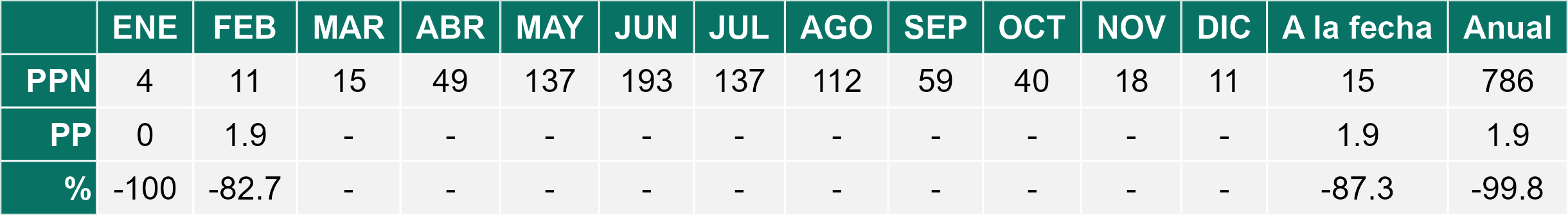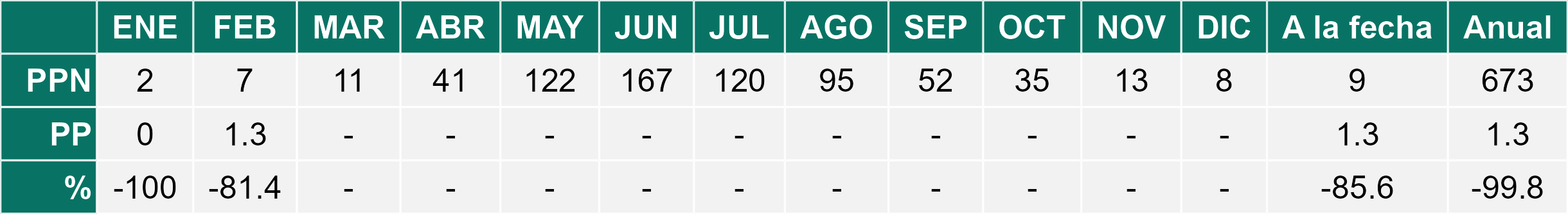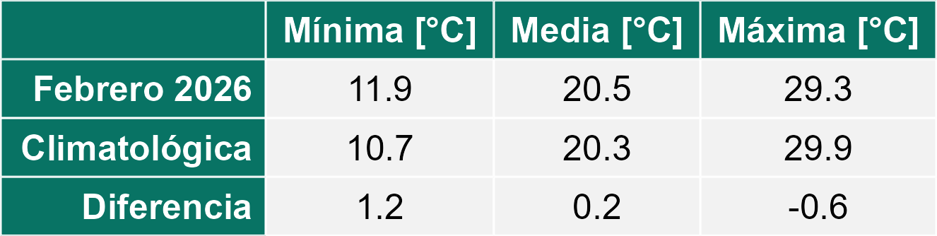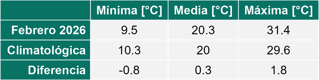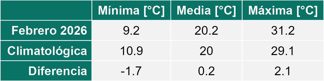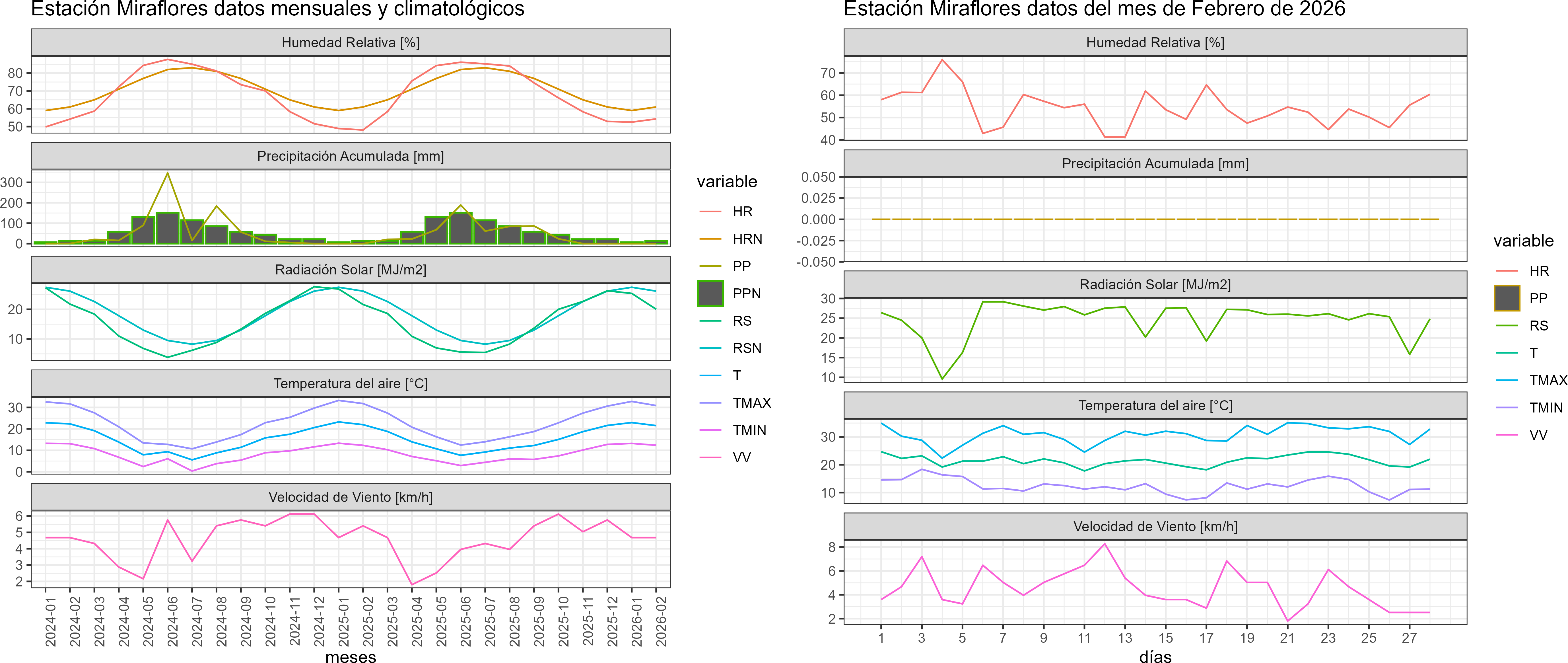La estación Miraflores corresponde al distrito agroclimático 7-8-4. Para este distrito climático la temperatura mínima, media y máxima climatológicas alcanzan los 11.3°C, 20.7°C y 30.2°C respectivamente. Por su parte, respecto a las temperaturas medidas durante el mes de febrero en la estación: la temperatura mínima alcanzo los 12.4°C (1.1°C sobre la climatológica), la temperatura media 21.5°C (0.8°C sobre la climatológica) y la temperatura máxima llegó a los 30.9°C (0.7°C sobre la climatológica). En el mes de febrero se registró una pluviometría de 0 mm, lo cual representa un 0% con respecto al mismo mes de un año normal. De enero a febrero se ha registrado un total acumulado de 0 mm, en circunstancias que un año normal registraría a la fecha 13 mm, lo que representa un déficit de 100%. A la misma fecha, durante el año 2024 la precipitación alcanzaba los 0 mm.