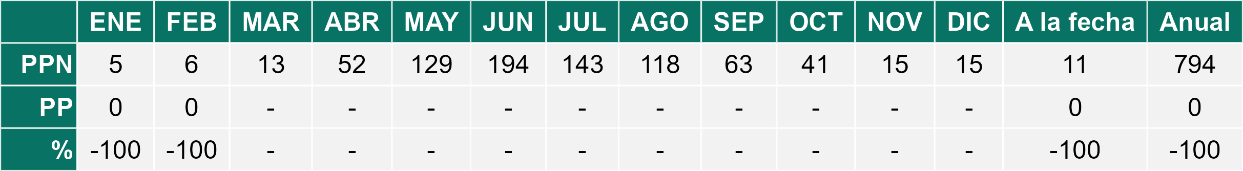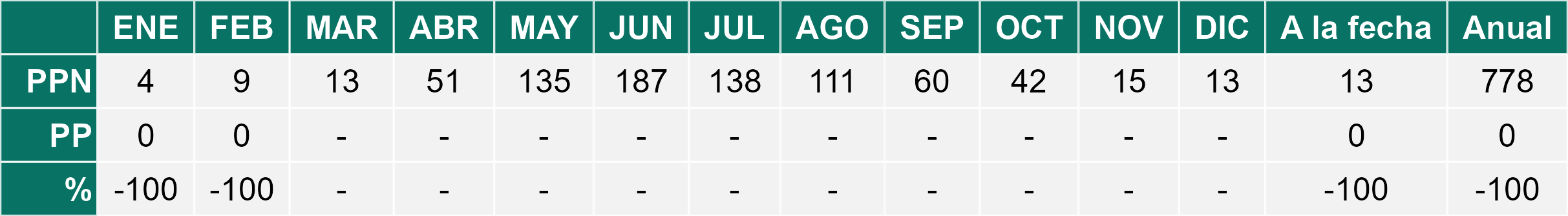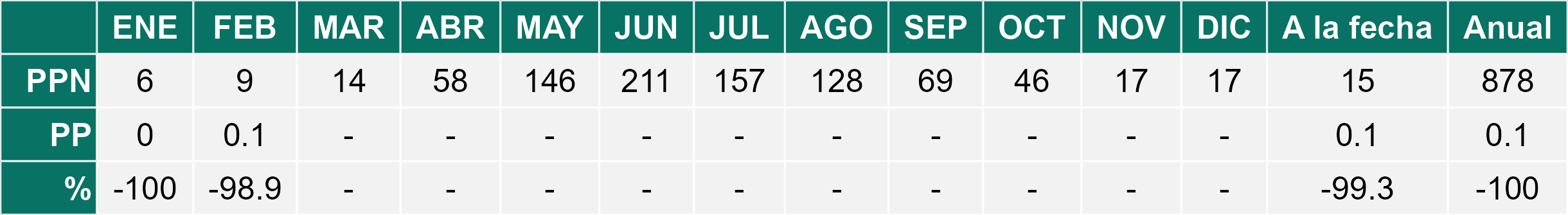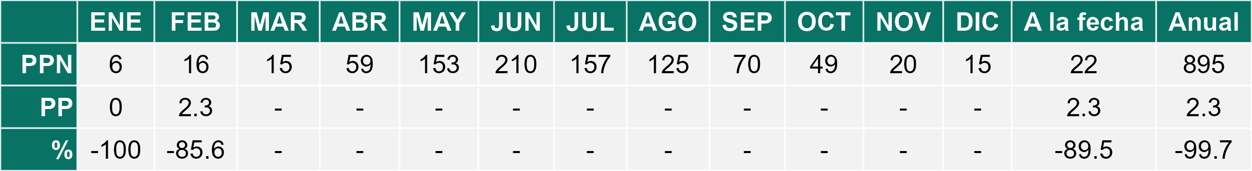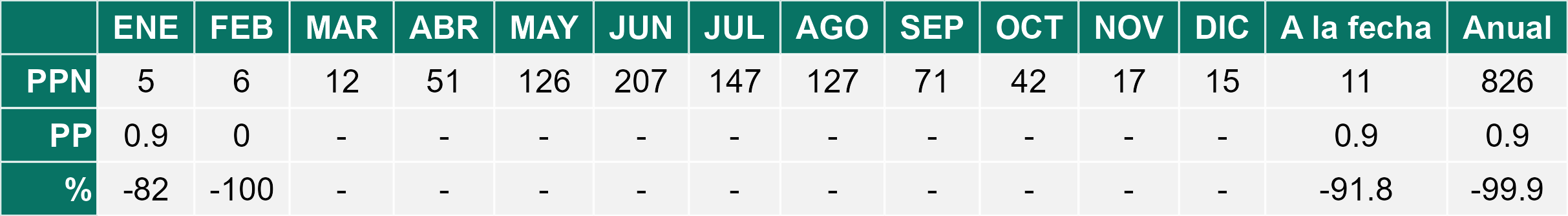 La estación Miraflores corresponde al distrito agroclimático 7-8-4. Para este distrito climático la temperatura mínima, media y máxima climatológicas alcanzan los 11.3°C, 20.7°C y 30.2°C respectivamente. Por su parte, respecto a las temperaturas medidas durante el mes de febrero en la estación: la temperatura mínima alcanzo los 12.4°C (1.1°C sobre la climatológica), la temperatura media 21.5°C (0.8°C sobre la climatológica) y la temperatura máxima llegó a los 30.9°C (0.7°C sobre la climatológica). En el mes de febrero se registró una pluviometría de 0 mm, lo cual representa un 0% con respecto al mismo mes de un año normal. De enero a febrero se ha registrado un total acumulado de 0 mm, en circunstancias que un año normal registraría a la fecha 13 mm, lo que representa un déficit de 100%. A la misma fecha, durante el año 2024 la precipitación alcanzaba los 0 mm.