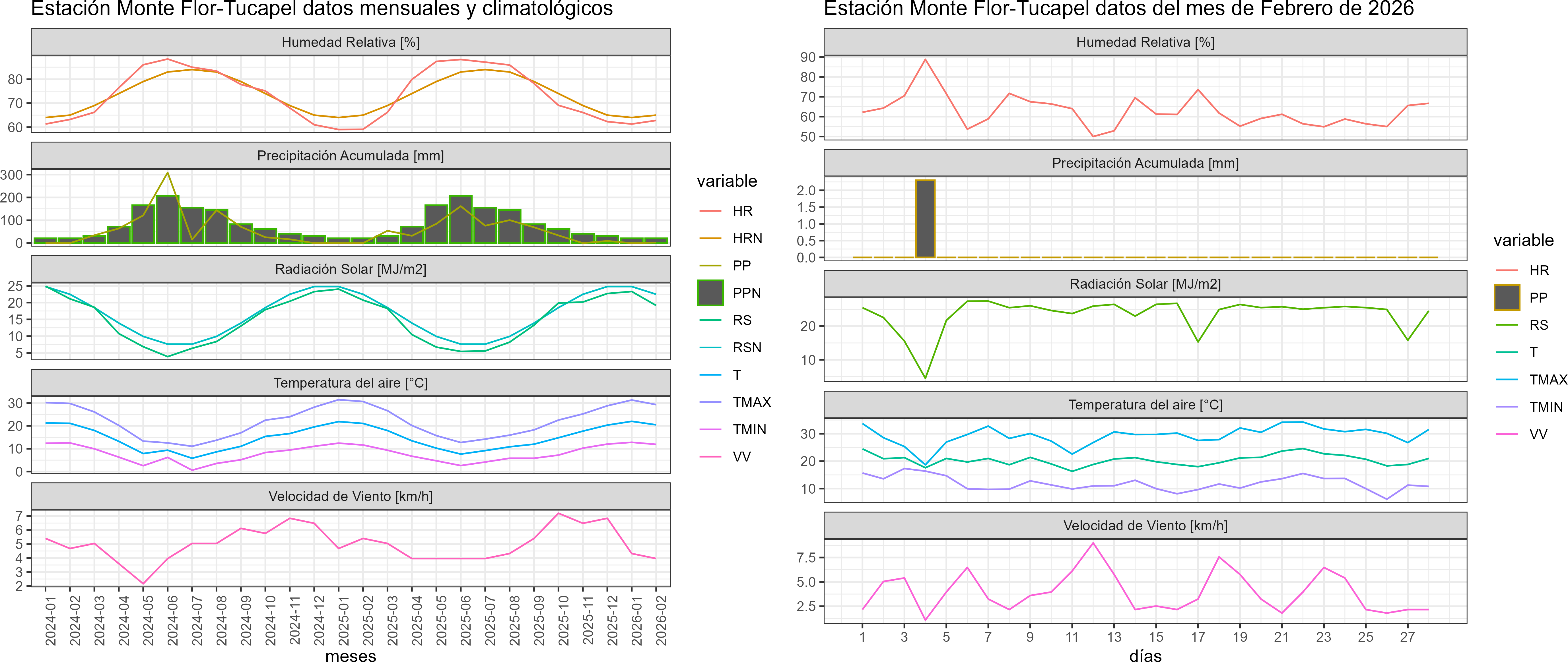 La estación Monte Flor-Tucapel corresponde al distrito agroclimático 7-9-1. Para este distrito climático la temperatura mínima, media y máxima climatológicas alcanzan los 10.7°C, 20.3°C y 29.9°C respectivamente. Por su parte, respecto a las temperaturas medidas durante el mes de febrero en la estación: la temperatura mínima alcanzo los 11.9°C (1.2°C sobre la climatológica), la temperatura media 20.5°C (0.2°C sobre la climatológica) y la temperatura máxima llegó a los 29.3°C (-0.6°C bajo la climatológica). En el mes de febrero se registró una pluviometría de 2.3 mm, lo cual representa un 14.4% con respecto al mismo mes de un año normal. De enero a febrero se ha registrado un total acumulado de 2.3 mm, en circunstancias que un año normal registraría a la fecha 22 mm, lo que representa un déficit de 89.5%. A la misma fecha, durante el año 2024 la precipitación alcanzaba los 0 mm.