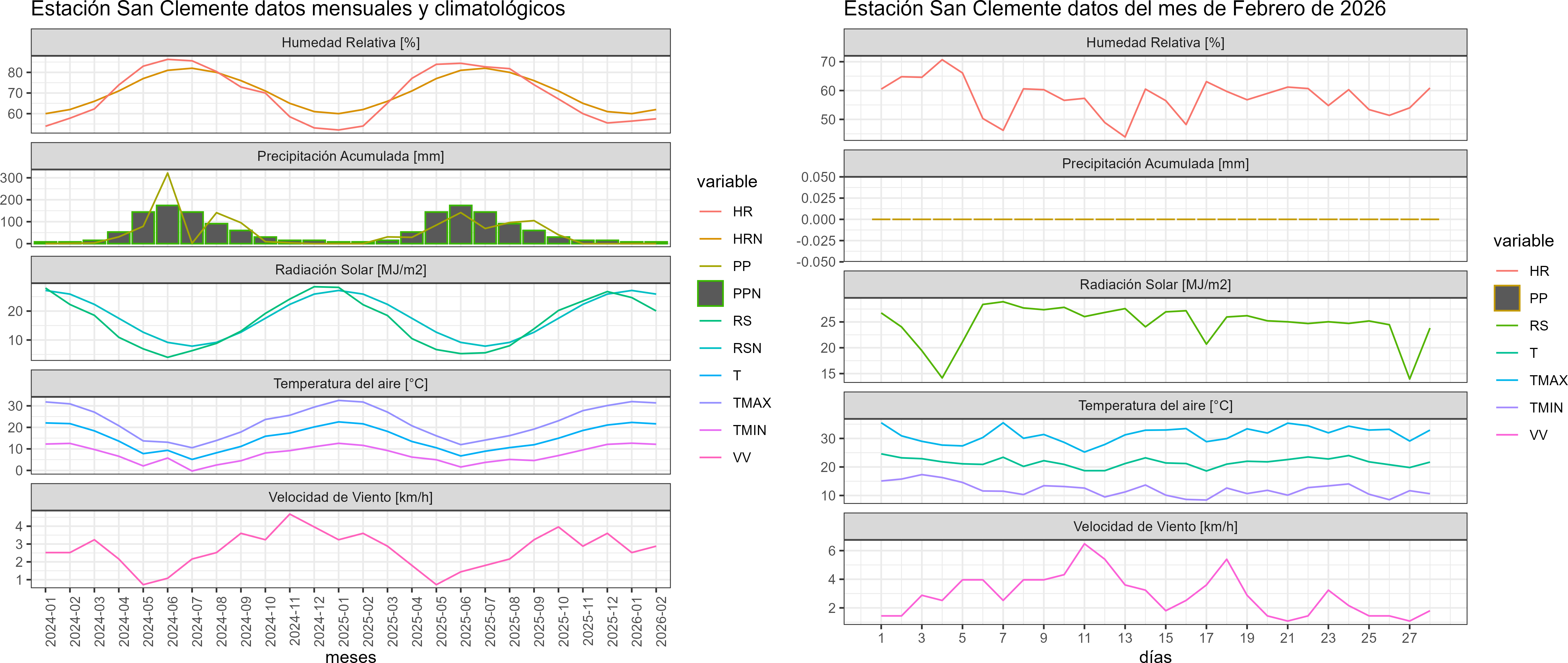 La estación San Clemente corresponde al distrito agroclimático 6-7-4. Para este distrito climático la temperatura mínima, media y máxima climatológicas alcanzan los 10.8°C, 20.3°C y 29.8°C respectivamente. Por su parte, respecto a las temperaturas medidas durante el mes de febrero en la estación: la temperatura mínima alcanzo los 12.1°C (1.3°C sobre la climatológica), la temperatura media 21.6°C (1.3°C sobre la climatológica) y la temperatura máxima llegó a los 31.4°C (1.6°C sobre la climatológica). En el mes de febrero se registró una pluviometría de 0 mm, lo cual representa un 0% con respecto al mismo mes de un año normal. De enero a febrero se ha registrado un total acumulado de 0 mm, en circunstancias que un año normal registraría a la fecha 11 mm, lo que representa un déficit de 100%. A la misma fecha, durante el año 2024 la precipitación alcanzaba los 0 mm.