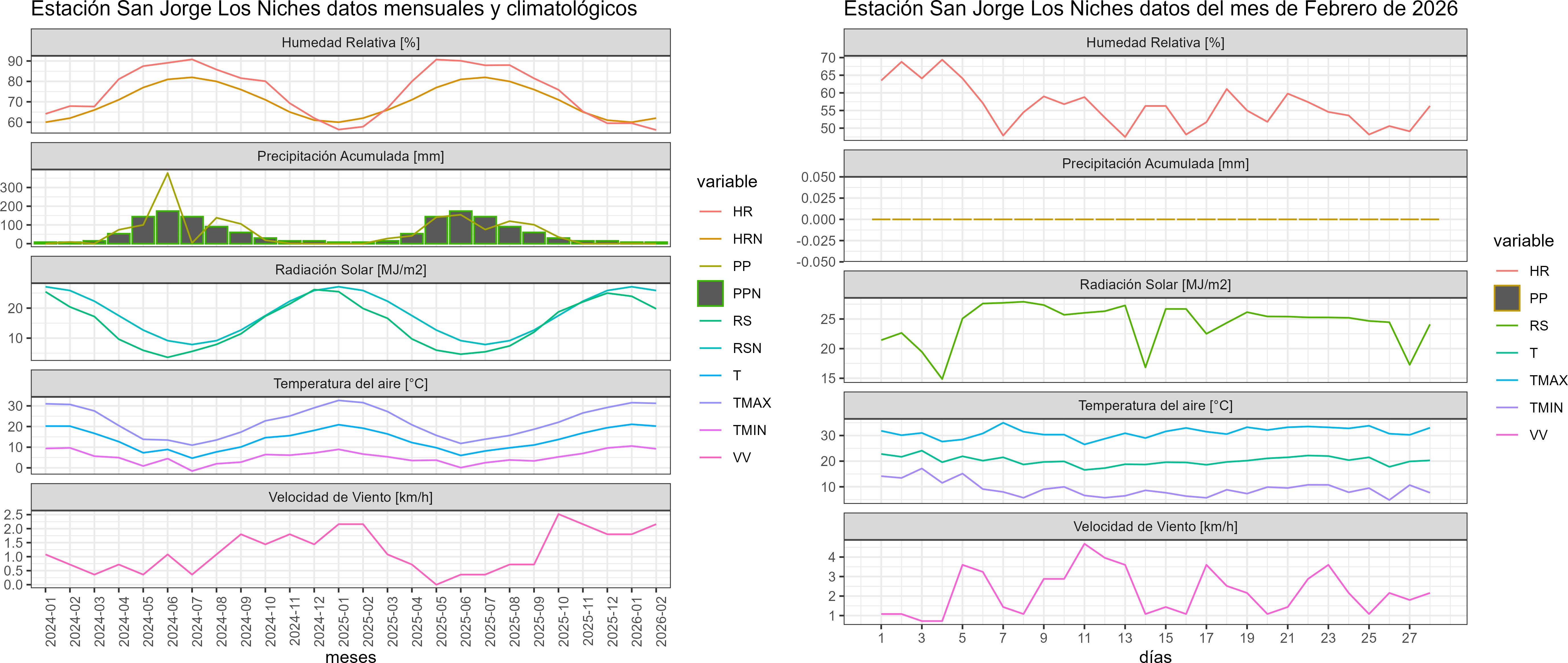 La estación San Jorge Los Niches corresponde al distrito agroclimático 6-7-4. Para este distrito climático la temperatura mínima, media y máxima climatológicas alcanzan los 10.9°C, 20°C y 29.1°C respectivamente. Por su parte, respecto a las temperaturas medidas durante el mes de febrero en la estación: la temperatura mínima alcanzo los 9.2°C (-1.7°C bajo la climatológica), la temperatura media 20.2°C (0.2°C sobre la climatológica) y la temperatura máxima llegó a los 31.2°C (2.1°C sobre la climatológica). En el mes de febrero se registró una pluviometría de 0 mm, lo cual representa un 0% con respecto al mismo mes de un año normal. De enero a febrero se ha registrado un total acumulado de 0.9 mm, en circunstancias que un año normal registraría a la fecha 11 mm, lo que representa un déficit de 91.8%. A la misma fecha, durante el año 2024 la precipitación alcanzaba los 0 mm.