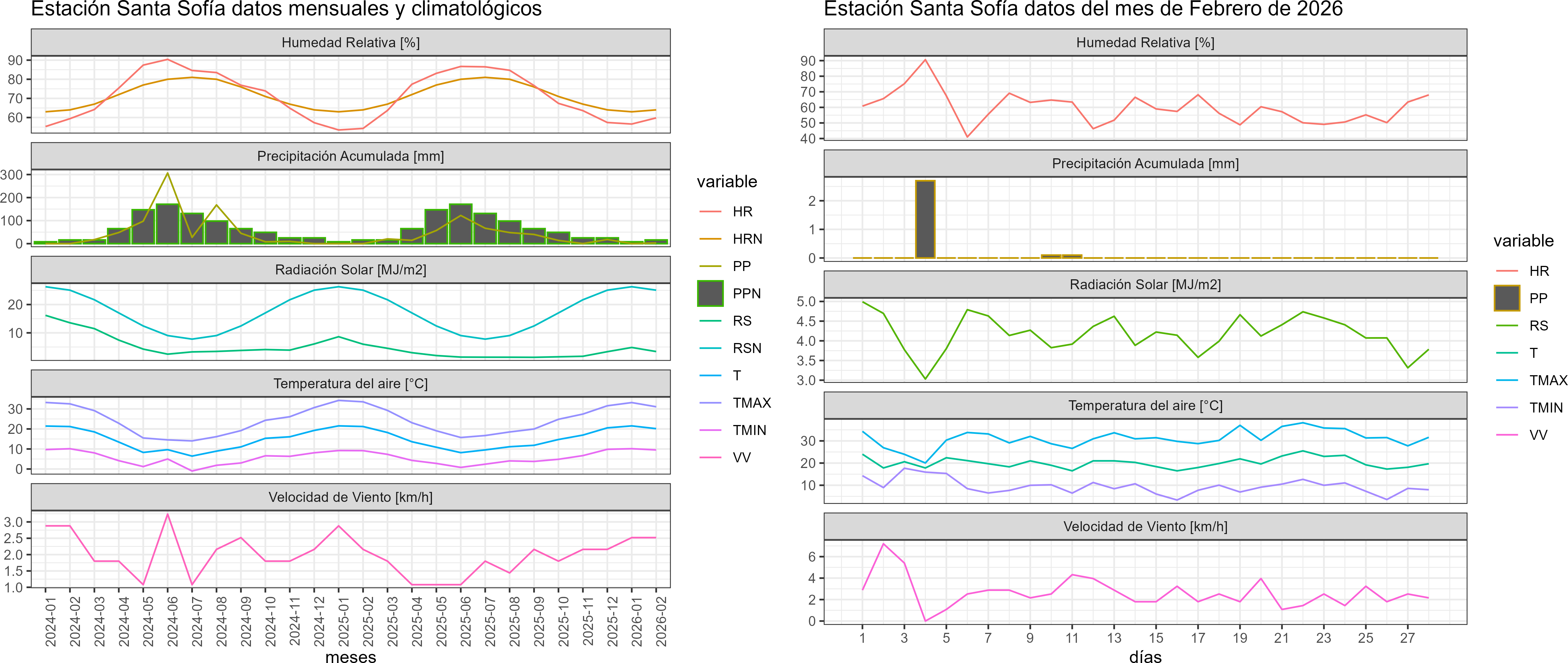 La estación Santa Sofía corresponde al distrito agroclimático 7-8-3. Para este distrito climático la temperatura mínima, media y máxima climatológicas alcanzan los 10.9°C, 19.5°C y 28°C respectivamente. Por su parte, respecto a las temperaturas medidas durante el mes de febrero en la estación: la temperatura mínima alcanzo los 9.5°C (-1.4°C bajo la climatológica), la temperatura media 20.1°C (0.6°C sobre la climatológica) y la temperatura máxima llegó a los 31.1°C (3.1°C sobre la climatológica). En el mes de febrero se registró una pluviometría de 2.9 mm, lo cual representa un 32.2% con respecto al mismo mes de un año normal. De enero a febrero se ha registrado un total acumulado de 2.9 mm, en circunstancias que un año normal registraría a la fecha 13 mm, lo que representa un déficit de 77.7%. A la misma fecha, durante el año 2024 la precipitación alcanzaba los 0 mm.