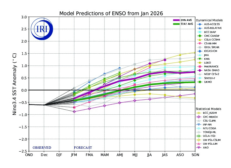 Figura 2. Evolución de Modelos de predicción del comportamiento del fenómeno ENSO representando la probabilidad de ocurrencia de La Niña en la mitad inferior del gráfico, y la de El Niño en la mitad superior del gráfico. Los registros en el rango entre -0.5 y +0.5 representan un pronóstico d condiciones neutras, y los registros sobre 0.5 indican el probable desarrollo del fenómeno del Niño.