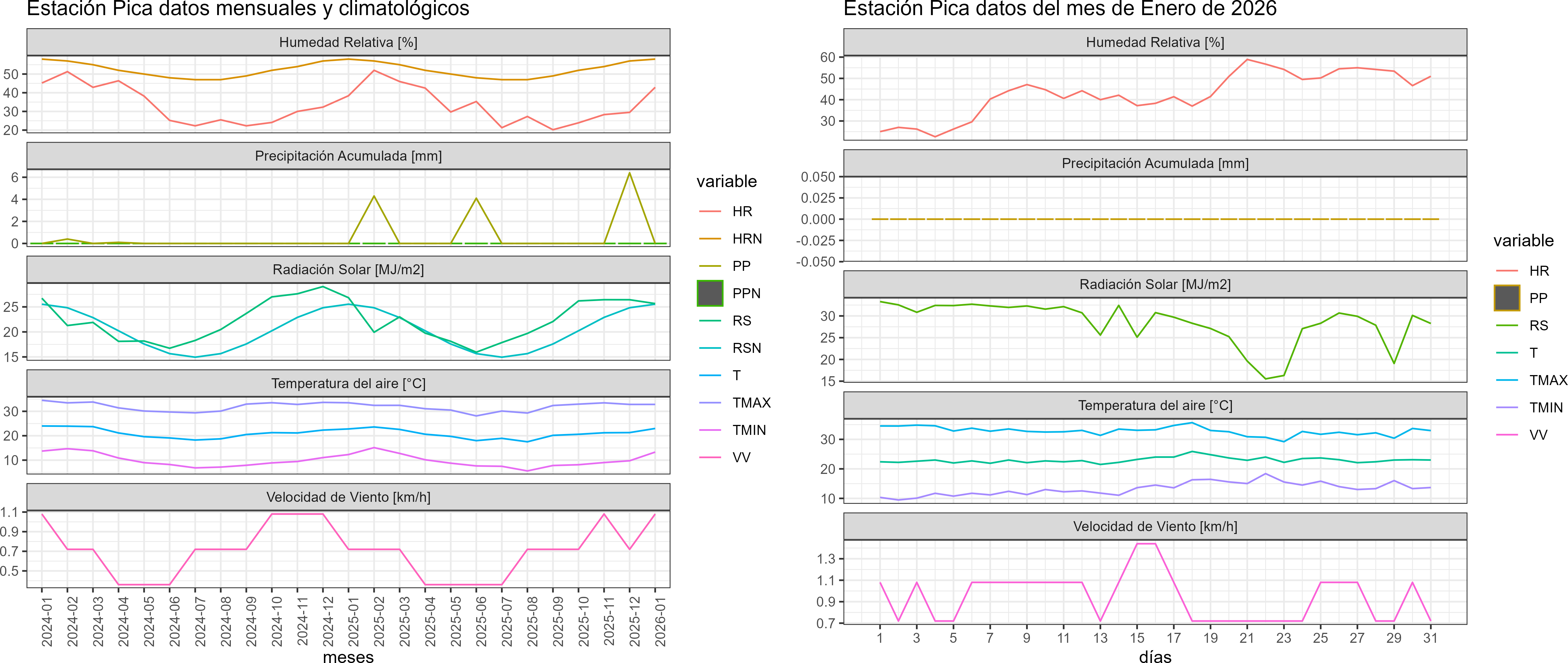 La estación Pica corresponde al distrito agroclimático 15-2-2. Para este distrito climático la temperatura mínima, media y máxima climatológicas alcanzan los 12.8°C, 21.9°C y 30.9°C respectivamente. Por su parte, respecto a las temperaturas medidas durante el mes de enero en la estación: la temperatura mínima alcanzo los 13.3°C (0.5°C sobre la climatológica), la temperatura media 23°C (1.1°C sobre la climatológica) y la temperatura máxima llegó a los 32.8°C (1.9°C sobre la climatológica). En el mes de enero se registró una pluviometría de 0 mm, lo cual representa un 0% con respecto al mismo mes de un año normal. De enero a enero se ha registrado un total acumulado de 0 mm, en circunstancias que un año normal registraría a la fecha 1 mm, lo que representa un déficit de 100%. A la misma fecha, durante el año 2024 la precipitación alcanzaba los 0 mm.