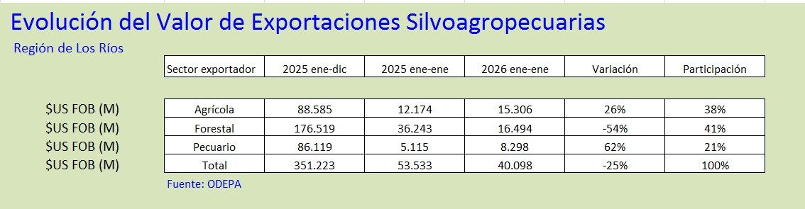 En la Región de Los Ríos durante el primer mes del año 2026, se ha producido una condición de menores precipitaciones que el promedio histórico. Las estaciones de la Provincia de Valdivia marcaron en promedio un déficit del 44 %, donde la cantidad de agua caída en el mes fue entre 56 mm en Paillaco y 34 mm en Máfil. En la Provincia del Ranco, las precipitaciones fluctuaron entre 82 mm en Rucatayo Rio bueno, y 35 mm en Palermo, en La Unión.