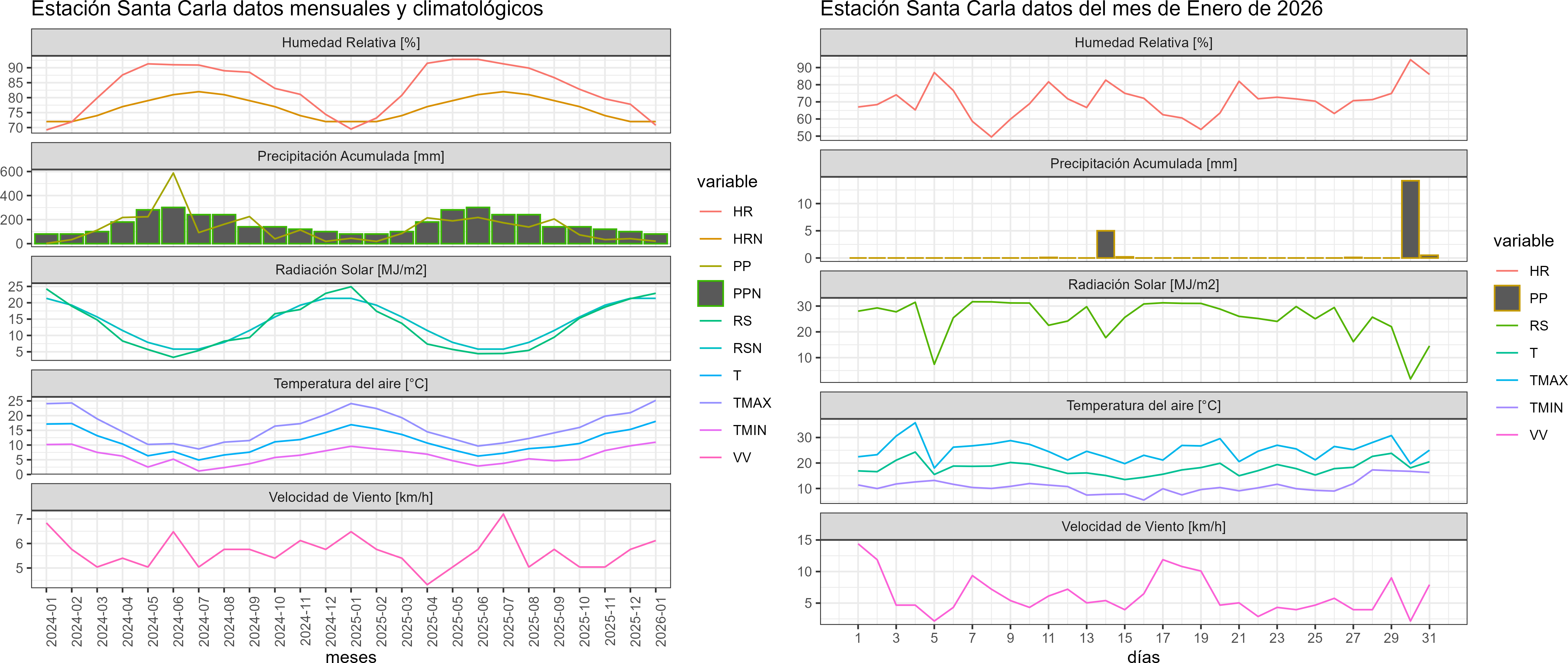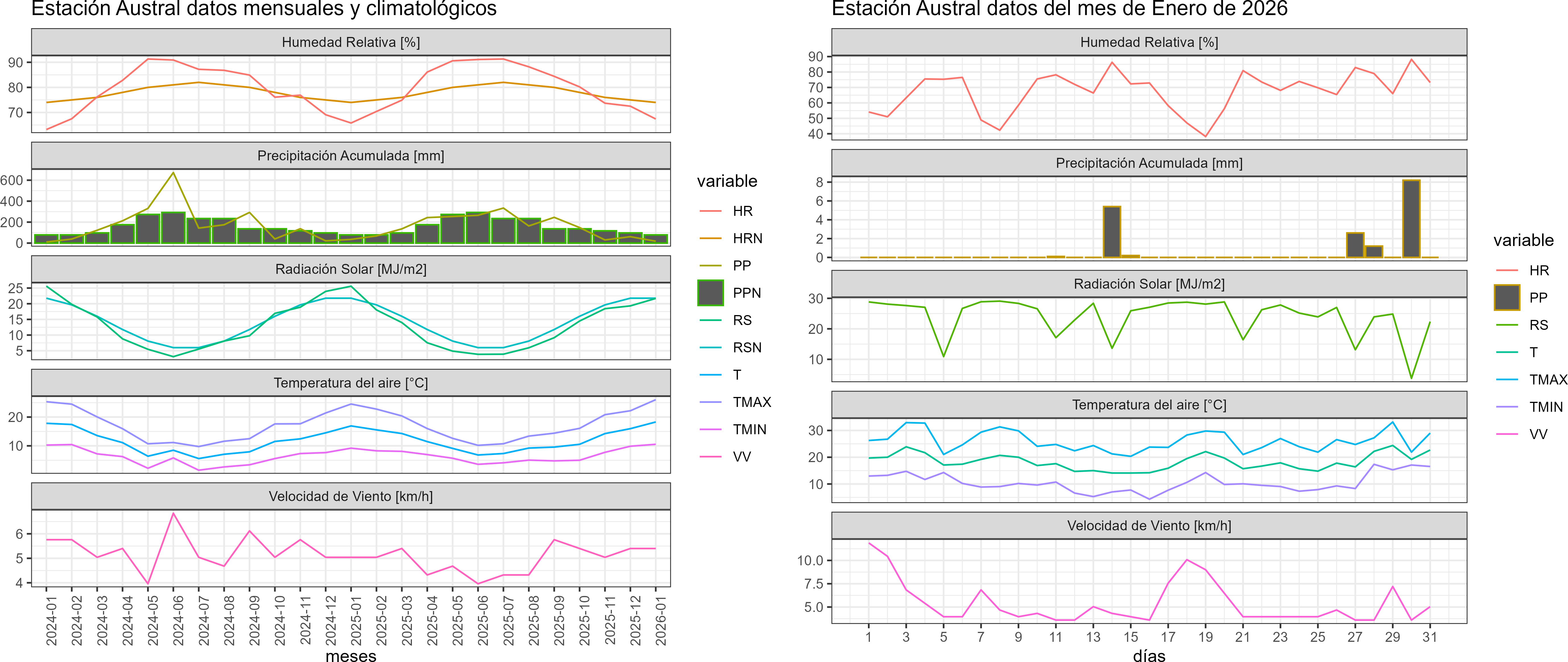 La estación Austral corresponde al distrito agroclimático 9-14-1. Para este distrito climático la temperatura mínima, media y máxima climatológicas alcanzan los 10.6°C, 16.5°C y 22.5°C respectivamente. Por su parte, respecto a las temperaturas medidas durante el mes de enero en la estación: la temperatura mínima alcanzo los 10.5°C (-0.1°C bajo la climatológica), la temperatura media 18.3°C (1.8°C sobre la climatológica) y la temperatura máxima llegó a los 26°C (3.5°C sobre la climatológica). En el mes de enero se registró una pluviometría de 17.7 mm, lo cual representa un 41.2% con respecto al mismo mes de un año normal. De enero a enero se ha registrado un total acumulado de 17.7 mm, en circunstancias que un año normal registraría a la fecha 43 mm, lo que representa un déficit de 58.8%. A la misma fecha, durante el año 2024 la precipitación alcanzaba los 35.2 mm.