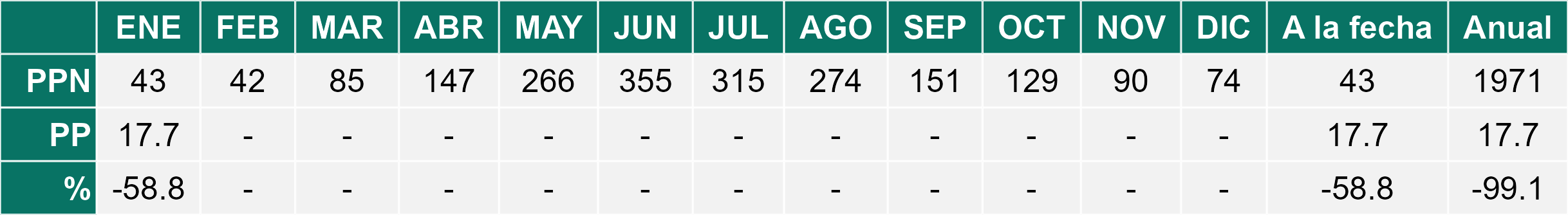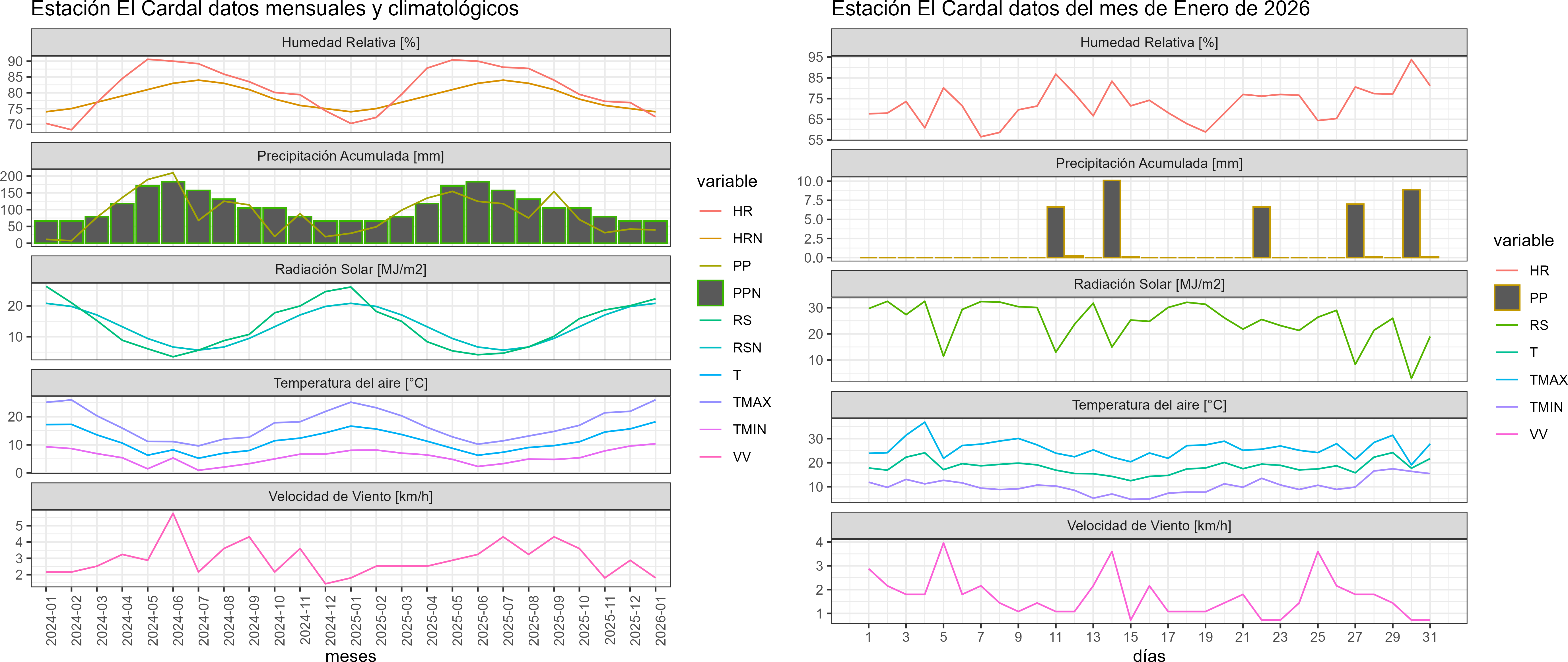 La estación El Cardal corresponde al distrito agroclimático 14-10-2. Para este distrito climático la temperatura mínima, media y máxima climatológicas alcanzan los 9°C, 16.4°C y 23.8°C respectivamente. Por su parte, respecto a las temperaturas medidas durante el mes de enero en la estación: la temperatura mínima alcanzo los 10.4°C (1.4°C sobre la climatológica), la temperatura media 18.2°C (1.8°C sobre la climatológica) y la temperatura máxima llegó a los 26°C (2.2°C sobre la climatológica). En el mes de enero se registró una pluviometría de 39.7 mm, lo cual representa un 107.3% con respecto al mismo mes de un año normal. De enero a enero se ha registrado un total acumulado de 39.7 mm, en circunstancias que un año normal registraría a la fecha 37 mm, lo que representa un superávit de 7.3%. A la misma fecha, durante el año 2024 la precipitación alcanzaba los 29.7 mm.