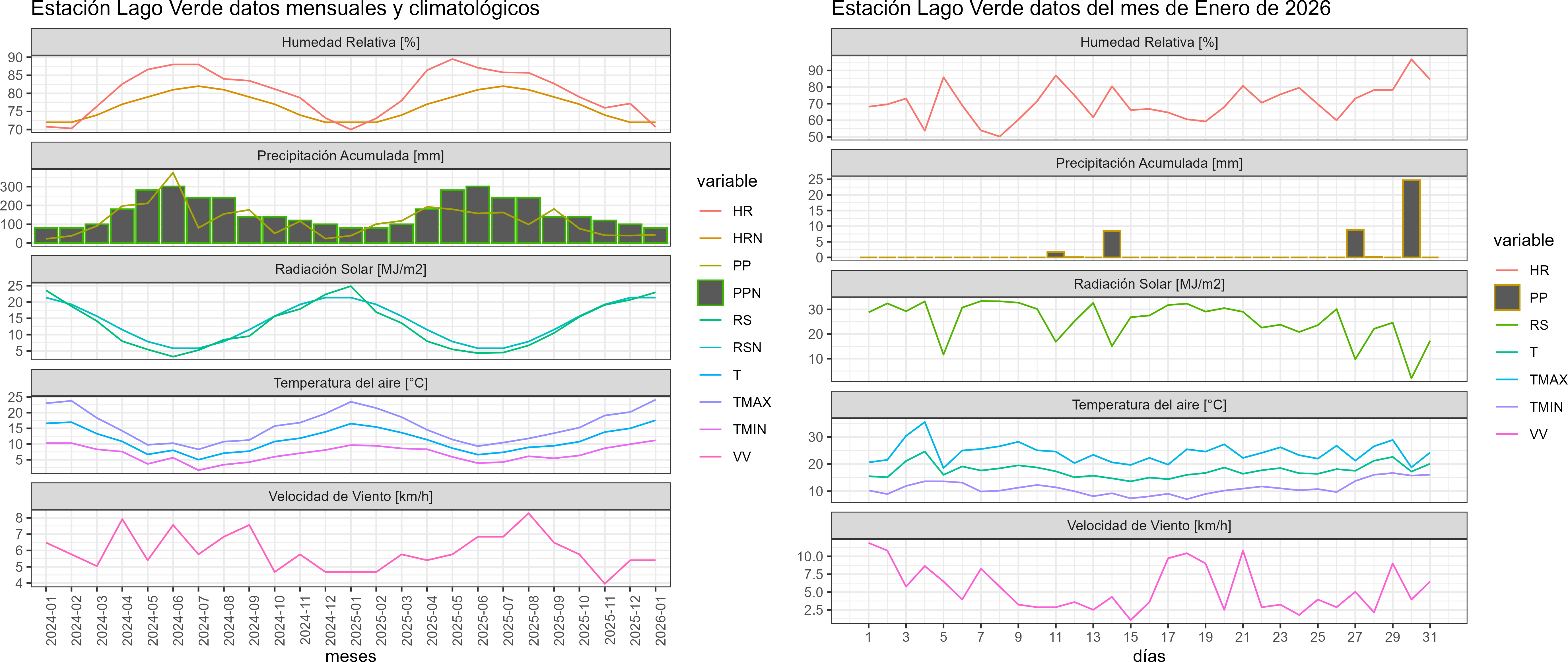 La estación Lago Verde corresponde al distrito agroclimático 9-14-2. Para este distrito climático la temperatura mínima, media y máxima climatológicas alcanzan los 9.3°C, 16°C y 22.7°C respectivamente. Por su parte, respecto a las temperaturas medidas durante el mes de enero en la estación: la temperatura mínima alcanzo los 11.2°C (1.9°C sobre la climatológica), la temperatura media 17.6°C (1.6°C sobre la climatológica) y la temperatura máxima llegó a los 24.1°C (1.4°C sobre la climatológica). En el mes de enero se registró una pluviometría de 44 mm, lo cual representa un 78.6% con respecto al mismo mes de un año normal. De enero a enero se ha registrado un total acumulado de 44 mm, en circunstancias que un año normal registraría a la fecha 56 mm, lo que representa un déficit de 21.4%. A la misma fecha, durante el año 2024 la precipitación alcanzaba los 39.4 mm.