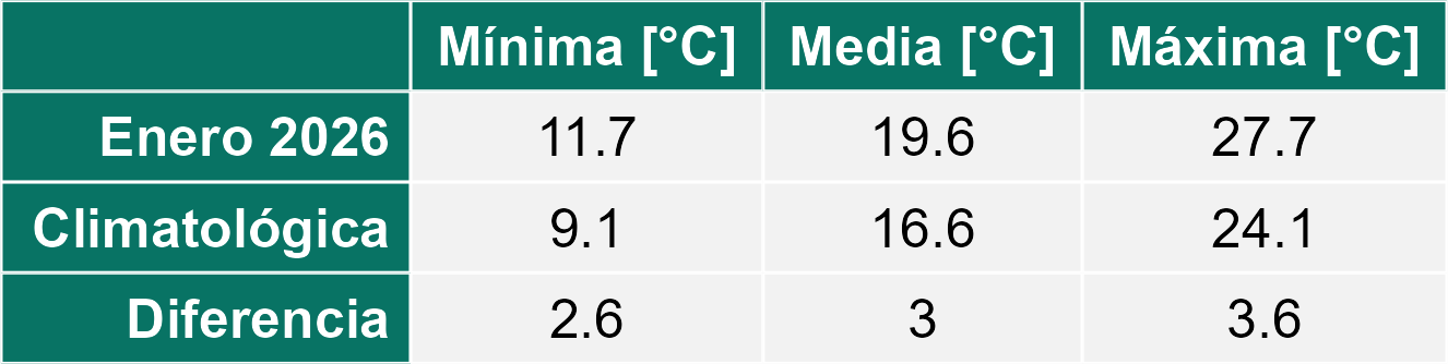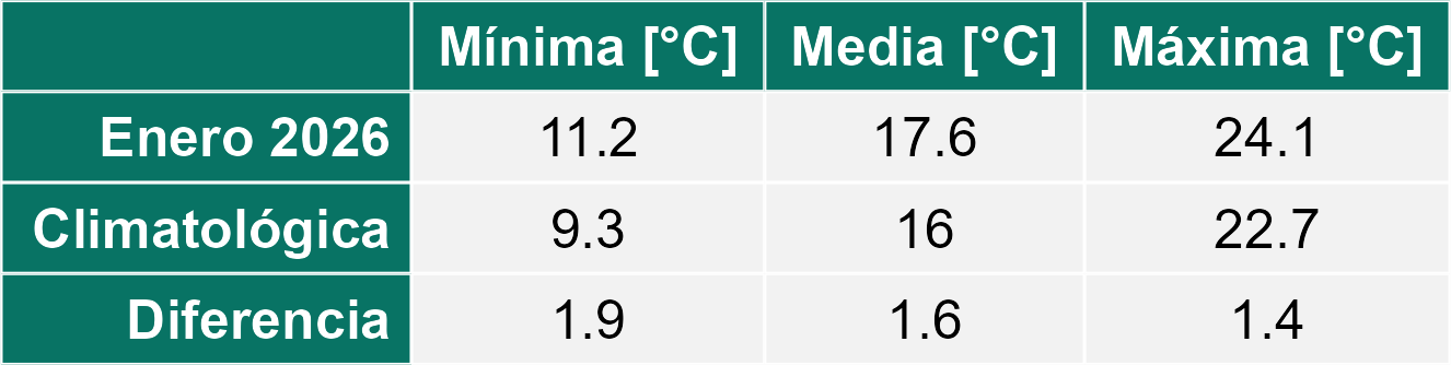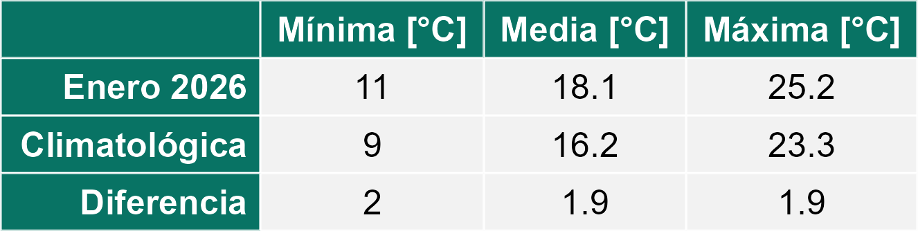 En relación a la temperatura, enero del 2026 se ha caracterizado por ser más caluroso que el promedio con valores más altos tanto en la temperatura mínima como en la temperatura máxima. En el caso de la temperatura mínima, los registros ubican en 1.5°C el incremento en el promedio mensual respecto al histórico. La máxima tuvo un incremento de 2.2 °C respecto al promedio.
