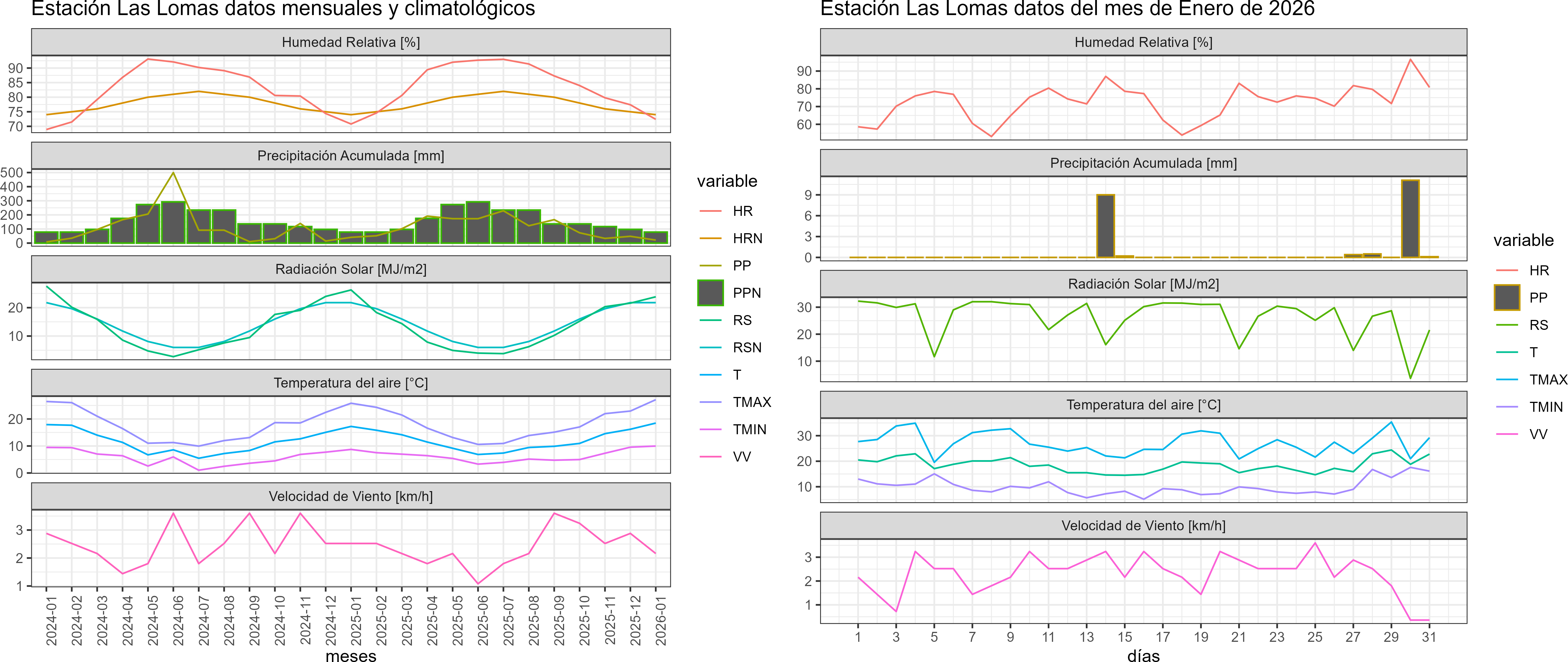 La estación Las Lomas corresponde al distrito agroclimático 9-14-1. Para este distrito climático la temperatura mínima, media y máxima climatológicas alcanzan los 9.2°C, 16.6°C y 24.1°C respectivamente. Por su parte, respecto a las temperaturas medidas durante el mes de enero en la estación: la temperatura mínima alcanzo los 10°C (0.8°C sobre la climatológica), la temperatura media 18.5°C (1.9°C sobre la climatológica) y la temperatura máxima llegó a los 27.1°C (3°C sobre la climatológica). En el mes de enero se registró una pluviometría de 21.3 mm, lo cual representa un 62.6% con respecto al mismo mes de un año normal. De enero a enero se ha registrado un total acumulado de 21.3 mm, en circunstancias que un año normal registraría a la fecha 34 mm, lo que representa un déficit de 37.4%. A la misma fecha, durante el año 2024 la precipitación alcanzaba los 40.8 mm.