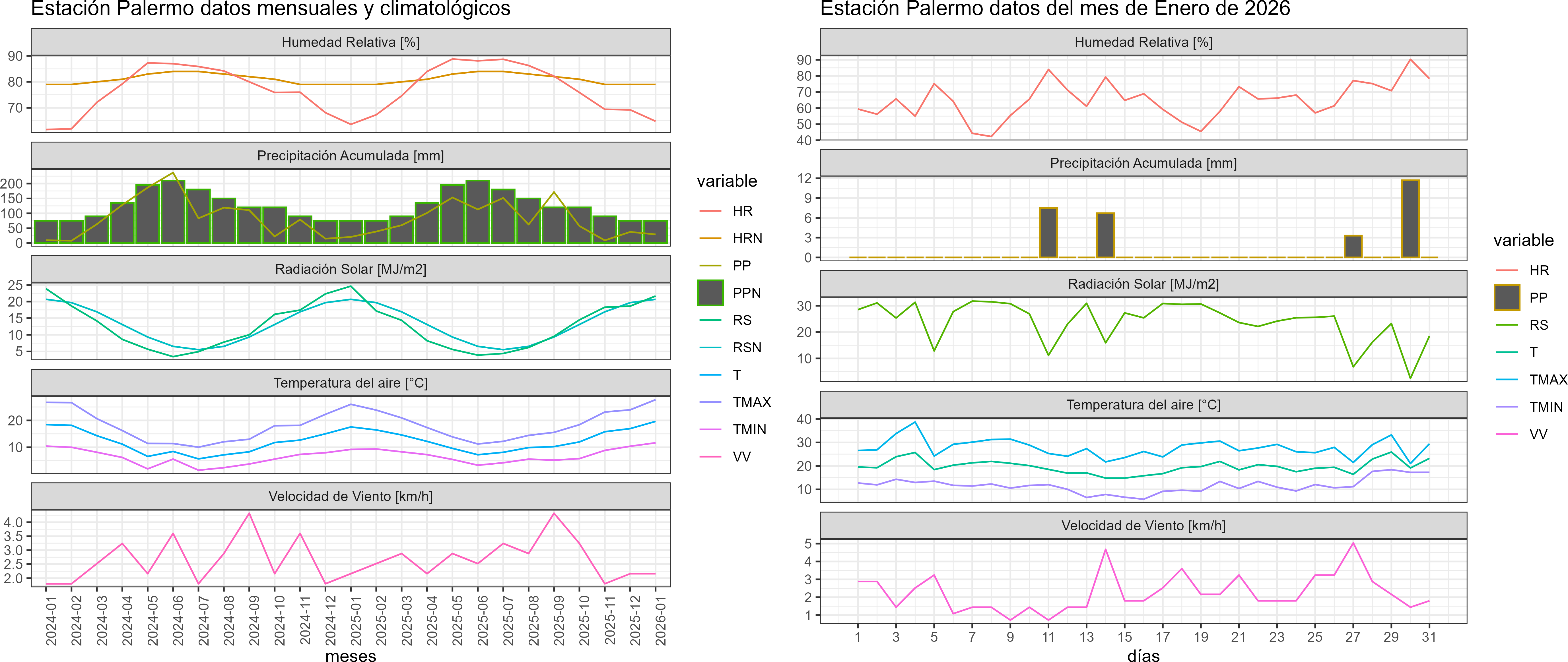La estación Palermo corresponde al distrito agroclimático 14-10-1. Para este distrito climático la temperatura mínima, media y máxima climatológicas alcanzan los 9.1°C, 16.6°C y 24.1°C respectivamente. Por su parte, respecto a las temperaturas medidas durante el mes de enero en la estación: la temperatura mínima alcanzo los 11.7°C (2.6°C sobre la climatológica), la temperatura media 19.6°C (3°C sobre la climatológica) y la temperatura máxima llegó a los 27.7°C (3.6°C sobre la climatológica). En el mes de enero se registró una pluviometría de 29.2 mm, lo cual representa un 83.4% con respecto al mismo mes de un año normal. De enero a enero se ha registrado un total acumulado de 29.2 mm, en circunstancias que un año normal registraría a la fecha 35 mm, lo que representa un déficit de 16.6%. A la misma fecha, durante el año 2024 la precipitación alcanzaba los 20.7 mm.