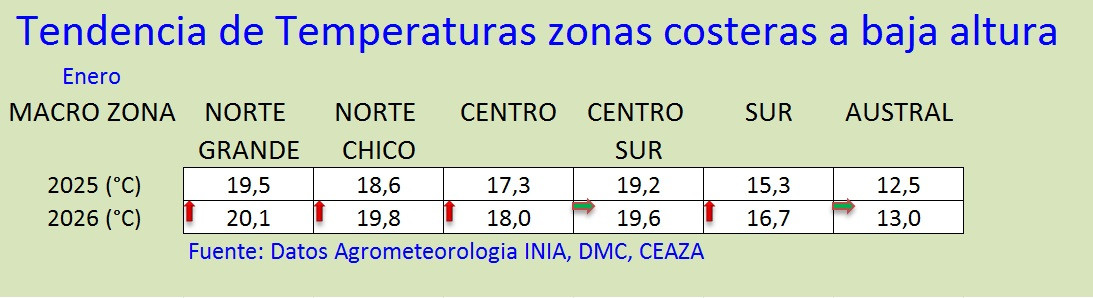 Figura 2.- Tendencias meteorológicas, los símbolos de flecha arriba indican tendencias mayores a las del año pasado y los símbolos de flecha hacia abajo representan tendencias menores al año pasado, en referencia a temperatura en zonas costeras y de valle interior. Fuente: Red agrometeorológica INIA.