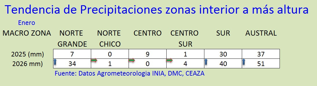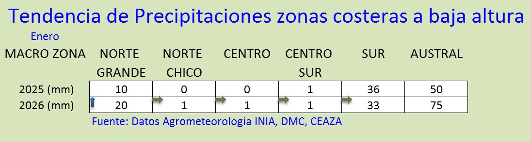 Figura 3.- Tendencias meteorológicas, los símbolos de flecha arriba indican tendencias mayores a las del año pasado y los símbolos de flecha hacia abajo representan tendencias menores al año pasado, en referencia a precipitaciones en zonas costeras y de valle interior. Fuente: Red agrometeorologica INIA.